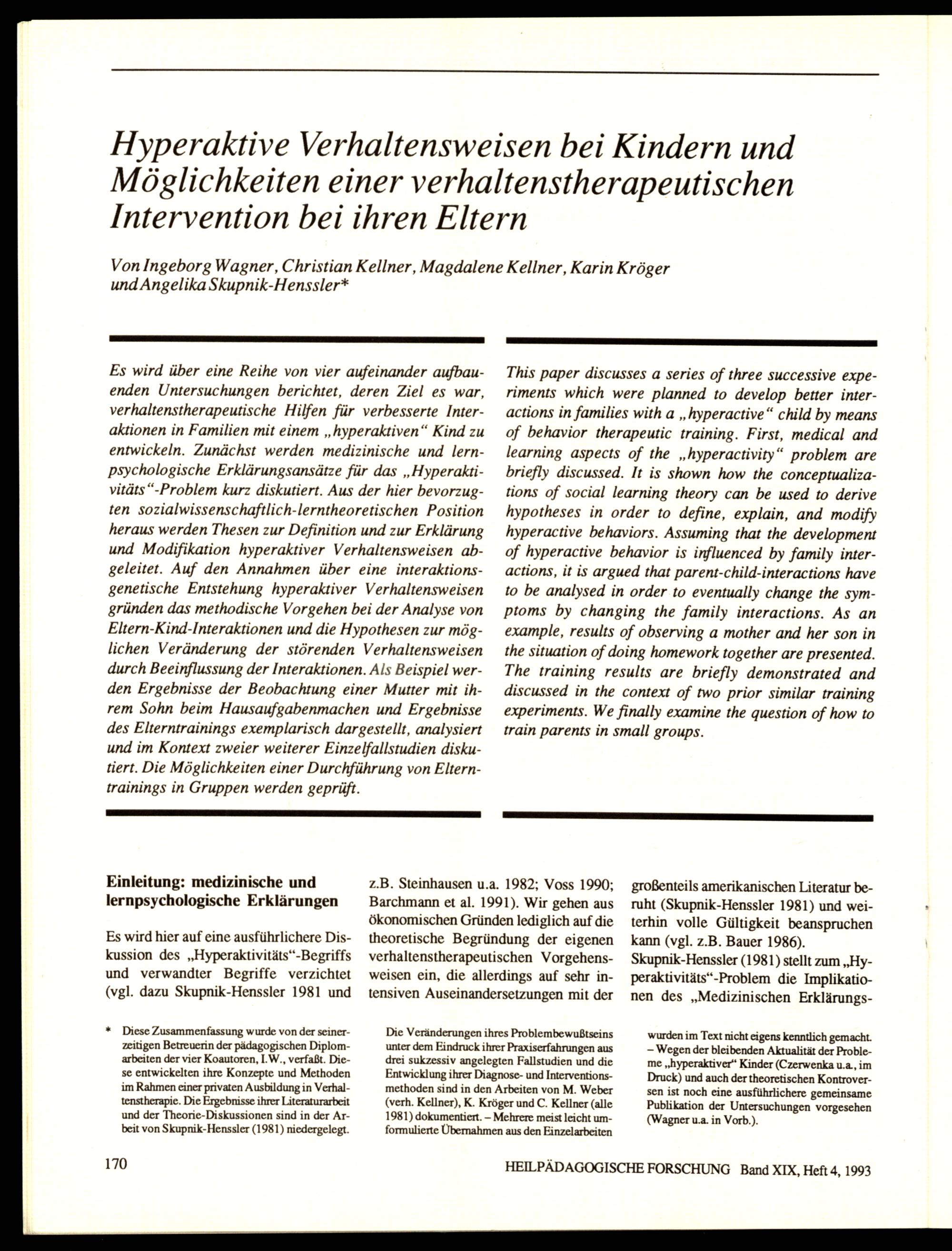 HEILPÄDAGOGISCHE FORSCHUNG Band XIX, Heft 4, 1993