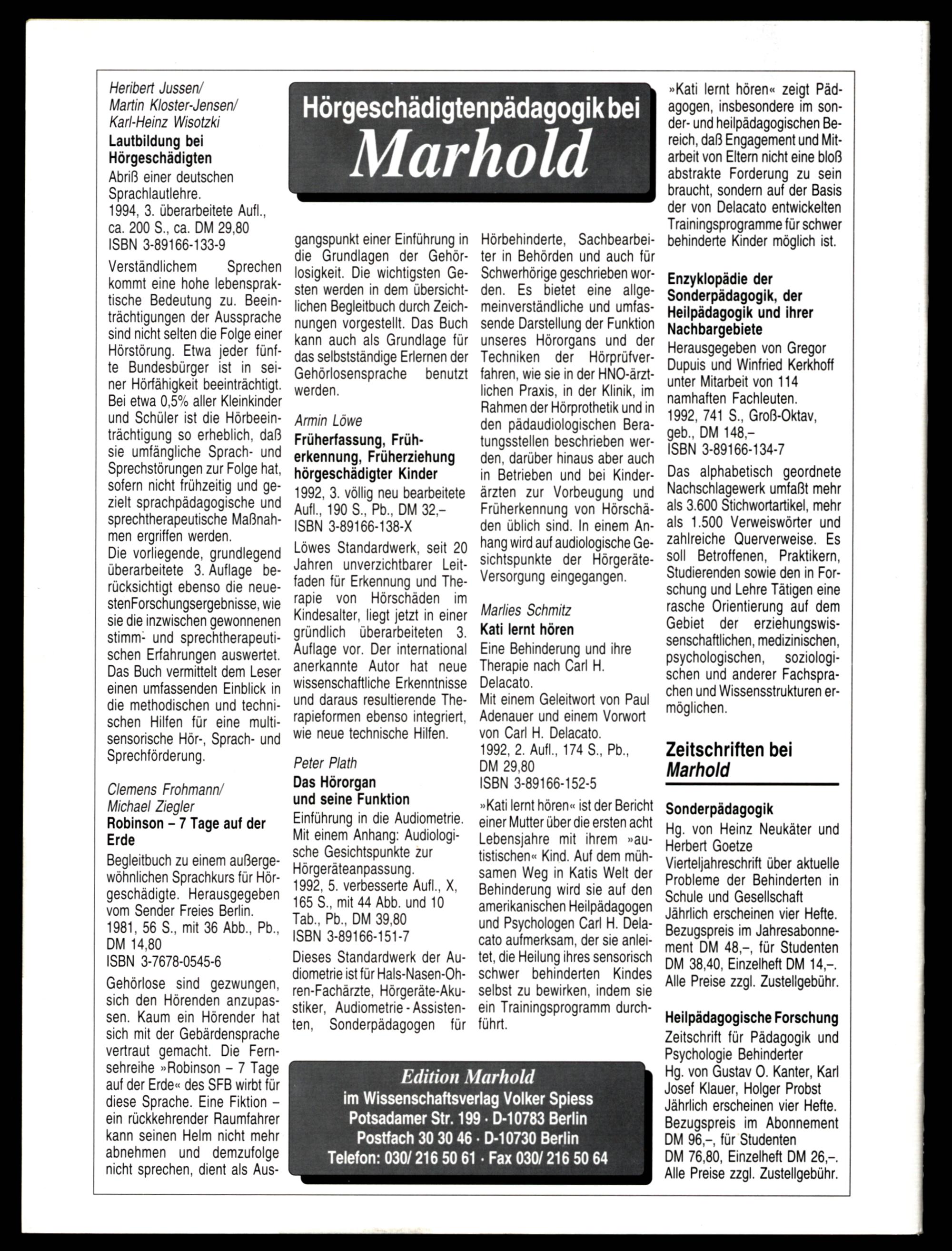 Edition Marhold im Wissenschaftsverlag Volker Spiess Potsadamer Str. 199- D-10783 Berlin Postfach 30 30 46- D-10730 Berlin Telefon: 030/216 50 61- Fax 030/ 216 50 64