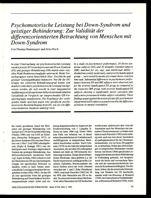 In einer Untersuchung zur psychomotorischen Leistung wurden jeweils 30 Versuchspersonen mit Down-Syndrom (DS) und geistiger Behinderung(GB) mittels einer visuellen Wahl-Reaktionszeitaufgabe untersucht. Beide Versuchsgruppen waren hinsichtlich Alter, Geschlecht und geistiger Leistungsfähigkeit balanciert. Nur für die DSGruppe mit schwerem Behinderungsgrad konnte eine deutlich schlechtere psychomotorische Leistung nachgewiesen werden, die sich sowohl in einer langsameren Ausführungszeit als auch einer höheren intraindividuellen Variabilität im Vergleich zur entsprechenden GB-Vergleichsgruppe manifestierte. Die Ergebnisse der vorliegenden Studie sprechen gegen eine spezifische psychomotorische Beeinträchtigung beim DS, wie sie von differenzorientierten Ansätzen nahelegt wird.