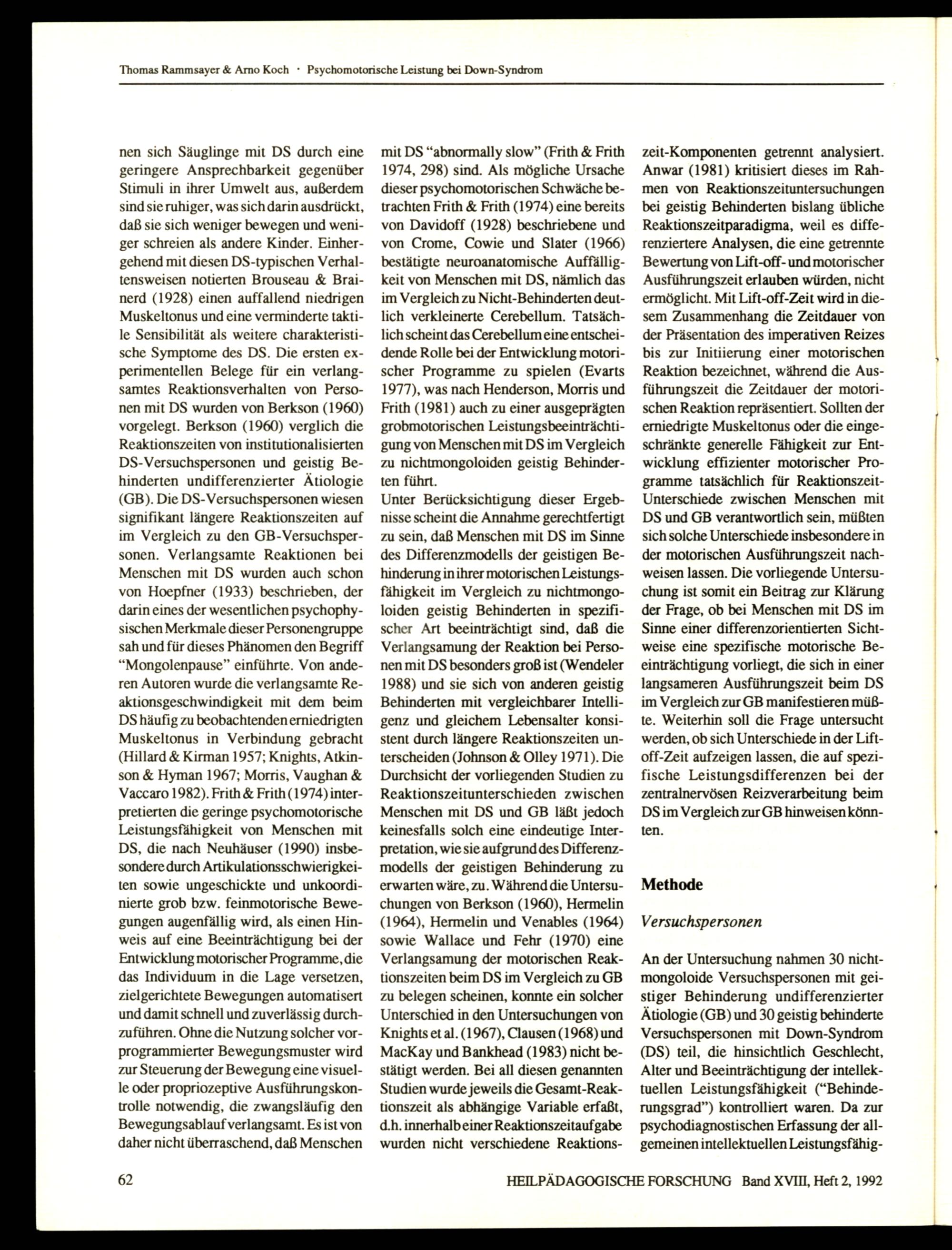 nen sich Säuglinge mit DS durch eine geringere Ansprechbarkeit gegenüber Stimuli in ihrer Umwelt aus, außerdem sind sie ruhiger, was sich darin ausdrückt, daß sie sich weniger bewegen und weniger schreien als andere Kinder. Einhergehend mit diesen DS-typischen Verhaltensweisen notierten Brouseau& Brainerd(1928) einen auffallend niedrigen Muskeltonus und eine verminderte taktile Sensibilität als weitere charakteristische Symptome des DS. Die ersten experimentellen Belege für ein verlangsamtes Reaktionsverhalten von Personen mit DS wurden von Berkson(1960) vorgelegt. Berkson(1960) verglich die Reaktionszeiten von institutionalisierten DS-Versuchspersonen und geistig Behinderten undifferenzierter Ätiologie (GB). Die DS-Versuchspersonen wiesen signifikant längere Reaktionszeiten auf im Vergleich zu den GB-Versuchspersonen. Verlangsamte Reaktionen bei Menschen mit DS wurden auch schon von Hoepfner(1933) beschrieben, der darin eines der wesentlichen psychophysischen Merkmale dieser Personengruppe sah und für dieses Phänomen den Begriff “Mongolenpause” einführte. Von anderen Autoren wurde die verlangsamte Reaktionsgeschwindigkeit mit dem beim DS häufig zu beobachtenden erniedrigten Muskeltonus in Verbindung gebracht (Hillard& Kirman 1957; Knights, Atkinson& Hyman 1967; Morris, Vaughan& Vaccaro 1982). Frith& Frith(1974) interpretierten die geringe psychomotorische Leistungsfähigkeit von Menschen mit DS, die nach Neuhäuser(1990) insbesondere durch Artikulationsschwierigkeiten sowie ungeschickte und unkoordinierte grob bzw. feinmotorische Bewegungen augenfällig wird, als einen Hinweis auf eine Beeinträchtigung bei der Entwicklung motorischer Programme, die das Individuum in die Lage versetzen, zielgerichtete Bewegungen automatisert und damit schnell und zuverlässig durchzuführen. Ohne die Nutzung solcher vorprogrammierter Bewegungsmuster wird zur Steuerung der Bewegung eine visuelle oder propriozeptive Ausführungskontrolle notwendig, die zwangsläufig den Bewegungsablauf verlangsamt. Es ist von daher nicht überraschend, daß Menschen