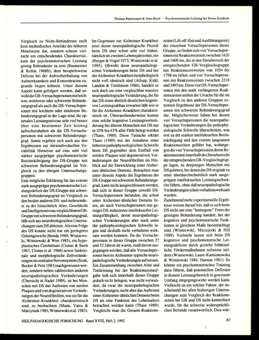 Im Gegensatz zur Alzheimer-Krankheit setzt dieser neuropathologische Prozeß beim DS aber schon sehr viel früher, nämlich im zweiten Lebensjahrzehnt, ein (Burger& Vogel 1973; Wisniewski et al. 1985). Obwohl diese neuropathologischen Veränderungen beim DS und bei der Alzheimer-Krankheit morphologisch nicht voll identisch sind(Allsup, Kidd, Landon& Tomlinson 1986), handelt es sich doch um eine vergleichbar massive neuropathologische Veränderung, die für das DS einen ähnlich deutlichen kognitiven Leistungsabbau erwarten läßt wie er für die Alzheimer-Krankheit charakteristisch ist. Überraschenderweise konnte eine solche kognitive Leistungsverminderung bei älteren Menschen mit DS nur in 10% bis 45% aller Fälle belegt werden (Thase, 1989). Diese Tatsache erklärt Thase(1989) mit der Annahme einer höheren pathophysiologischen Schwelle beim DS gegenüber dem Einfluß von senilen Plaques und degenerativen Veränderungen der Neurofibrillen im Hinblick auf die Entwicklung einer Alzheimer-ähnlichen Demenz. Betrachtet man unter diesem Aspekt die Ergebnisse der DS-Gruppe mit schwerem Behinderungsgrad, kann nicht ausgeschlossen werden, daß sich in dieser Gruppe sowohl DSVersuchspersonen befanden, die schon unter Alzheimer-ähnlicher Demenz litten, als auch Versuchspersonen mit geringer DS-induzierter intellektueller Leistungsfähigkeit, deren neuropathologischen Veränderungen aber noch unter der pathophysiologischen Schwelle lagen und deshalb nicht verhaltens-wirksam werden konnten. Da die Versuchspersonen in dieser Gruppe zwischen 27 und 52 Jahren alt waren, muß davon ausgegangen werden, daß alle Versuchspersonen bereits Alzheimer-typische neuropathologische Veränderungen aufweisen. Ein Zusammenhang zwischen Alter und Testleistung bei der Reaktionszeitaufgabe ließ sich innerhalb dieser Gruppe jedoch nicht belegen, was nicht verwundert, da zwar die neuropathologischen Veränderungen, nicht aber das Auftreten einer Alzheimer-ähnlichen Demenz beim DS als eine Funktion des Lebensalters betrachtet werden kann(Thase 1989). Vergleicht man die Gesamt-Reaktions