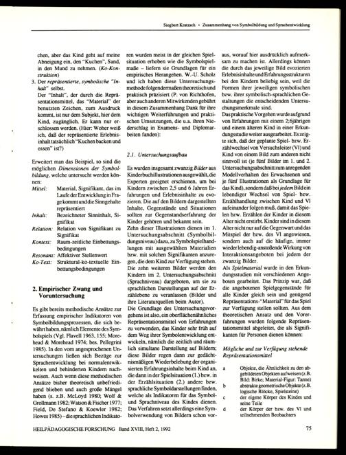 Es gibt bereits methodische Ansätze zur Erfassung empirischer Indikatoren von Symbolbildungsprozessen, die sich bewährt haben, nämlich Elemente des Symbolspiels(Vgl. Flavell 1963, 155; Morehead& Morehead 1974; bes. Pellegrini 1985). In den vorn angesprochenen Untersuchungen ließen sich Bezüge zur Sprachentwicklung bei normalentwikkelten und behinderten Kindern nachweisen. Auch wenn diese methodischen Ansätze bisher theoretisch unbefriedigend blieben und auch große Mängel haben(s. z.B. McLoyd 1980; Wolf& Grollmann 1982; Watson& Fischer 1977; Field, De Stefano& Koewler 1982; Howes 1985)— die sprachlichen Indikato