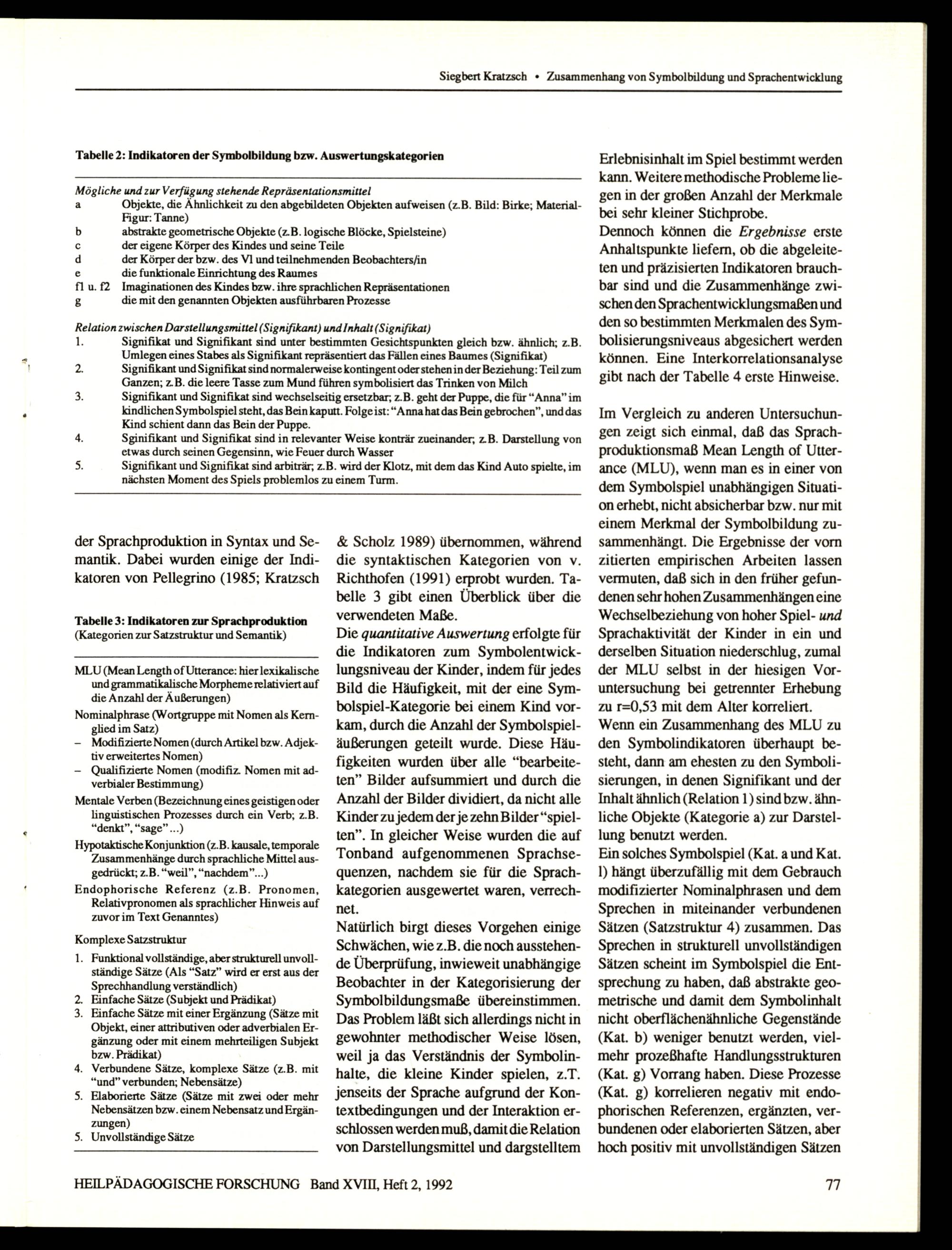 Im Vergleich zu anderen Untersuchungen zeigt sich einmal, daß das Sprachproduktionsmaß Mean Length of Utterance(MLU), wenn man es in einer von dem Symbolspiel unabhängigen Situation erhebt, nicht absicherbar bzw. nur mit einem Merkmal der Symbolbildung zusammenhängt. Die Ergebnisse der vorn zitierten empirischen Arbeiten lassen vermuten, daß sich in den früher gefundenen sehr hohen Zusammenhängen eine Wechselbeziehung von hoher Spiel- und Sprachaktivität der Kinder in ein und derselben Situation niederschlug, zumal der MLU selbst in der hiesigen Voruntersuchung bei getrennter Erhebung zu r=0,53 mit dem Alter korreliert. Wenn ein Zusammenhang des MLU zu den Symbolindikatoren überhaupt besteht, dann am ehesten zu den Symbolisierungen, in denen Signifikant und der Inhalt ähnlich(Relation 1) sind bzw. ähnliche Objekte(Kategorie a) zur Darstellung benutzt werden.