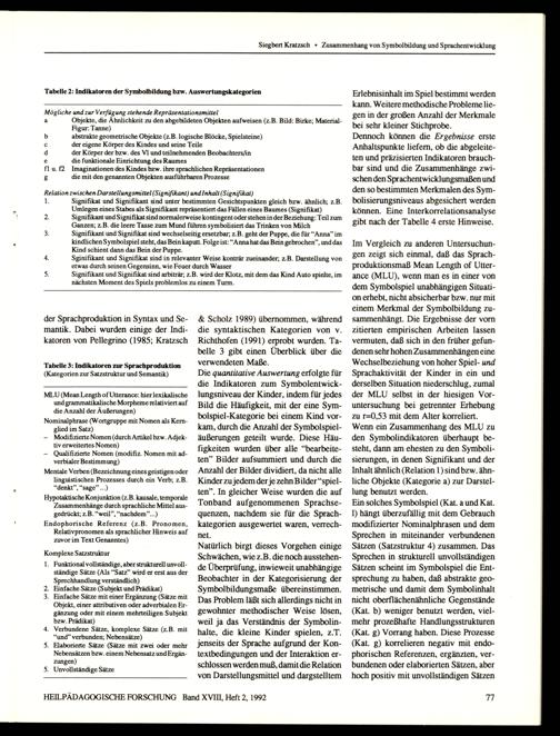 Natürlich birgt dieses Vorgehen einige Schwächen, wie z.B. die noch ausstehende Überprüfung, inwieweit unabhängige Beobachter in der Kategorisierung der Symbolbildungsmaße übereinstimmen. Das Problem läßt sich allerdings nicht in gewohnter methodischer Weise lösen, weil ja das Verständnis der Symbolinhalte, die kleine Kinder spielen, z.T. jenseits der Sprache aufgrund der Kontextbedingungen und der Interaktion erschlossen werden muß, damit die Relation von Darstellungsmittel und dargstelltem