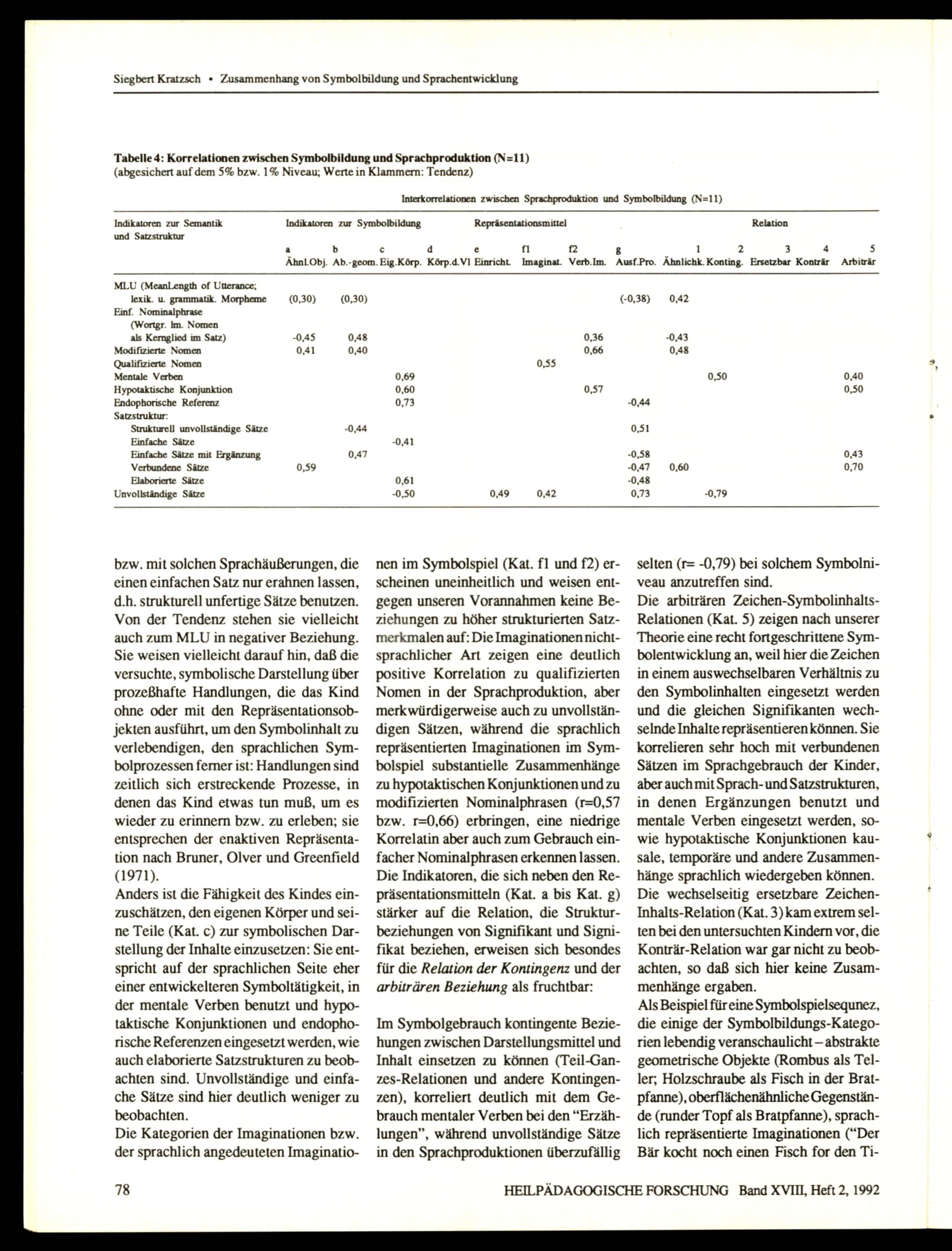nen im Symbolspiel(Kat. fl und f2) erscheinen uneinheitlich und weisen entgegen unseren Vorannahmen keine Beziehungen zu höher strukturierten Satzmerkmalen auf: Die Imaginationen nichtsprachlicher Art zeigen eine deutlich positive Korrelation zu qualifizierten Nomen in der Sprachproduktion, aber merkwürdigerweise auch zu unvollständigen Sätzen, während die sprachlich repräsentierten Imaginationen im Symbolspiel substantielle Zusammenhänge zu hypotaktischen Konjunktionen und zu modifizierten Nominalphrasen(r=0,57 bzw. r=0,66) erbringen, eine niedrige Korrelatin aber auch zum Gebrauch einfacher Nominalphrasen erkennen lassen. Die Indikatoren, die sich neben den Repräsentationsmitteln(Kat. a bis Kat. g) stärker auf die Relation, die Strukturbeziehungen von Signifikant und Signifikat beziehen, erweisen sich besondes für die Relation der Kontingenz und der arbiträren Beziehung als fruchtbar: