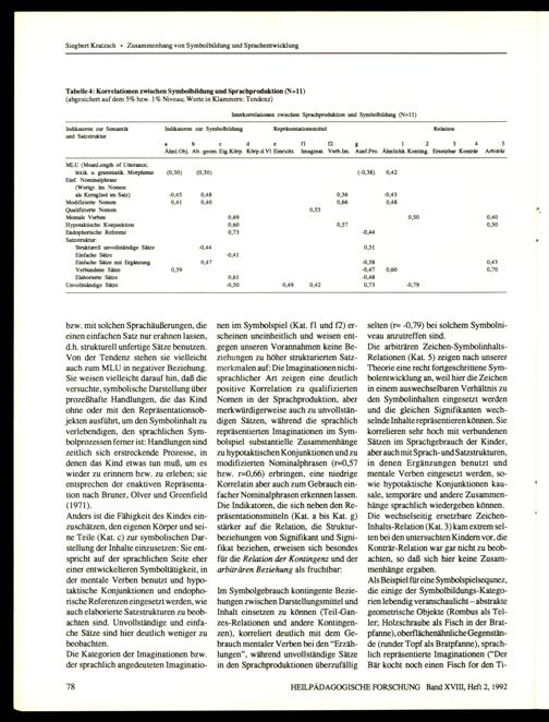 Tabelle 4: Korrelationen zwischen Symbolbildung und Sprachproduktion(N=11) (abgesichert auf dem 5% bzw. 1% Niveau; Werte in Klammern: Tendenz)