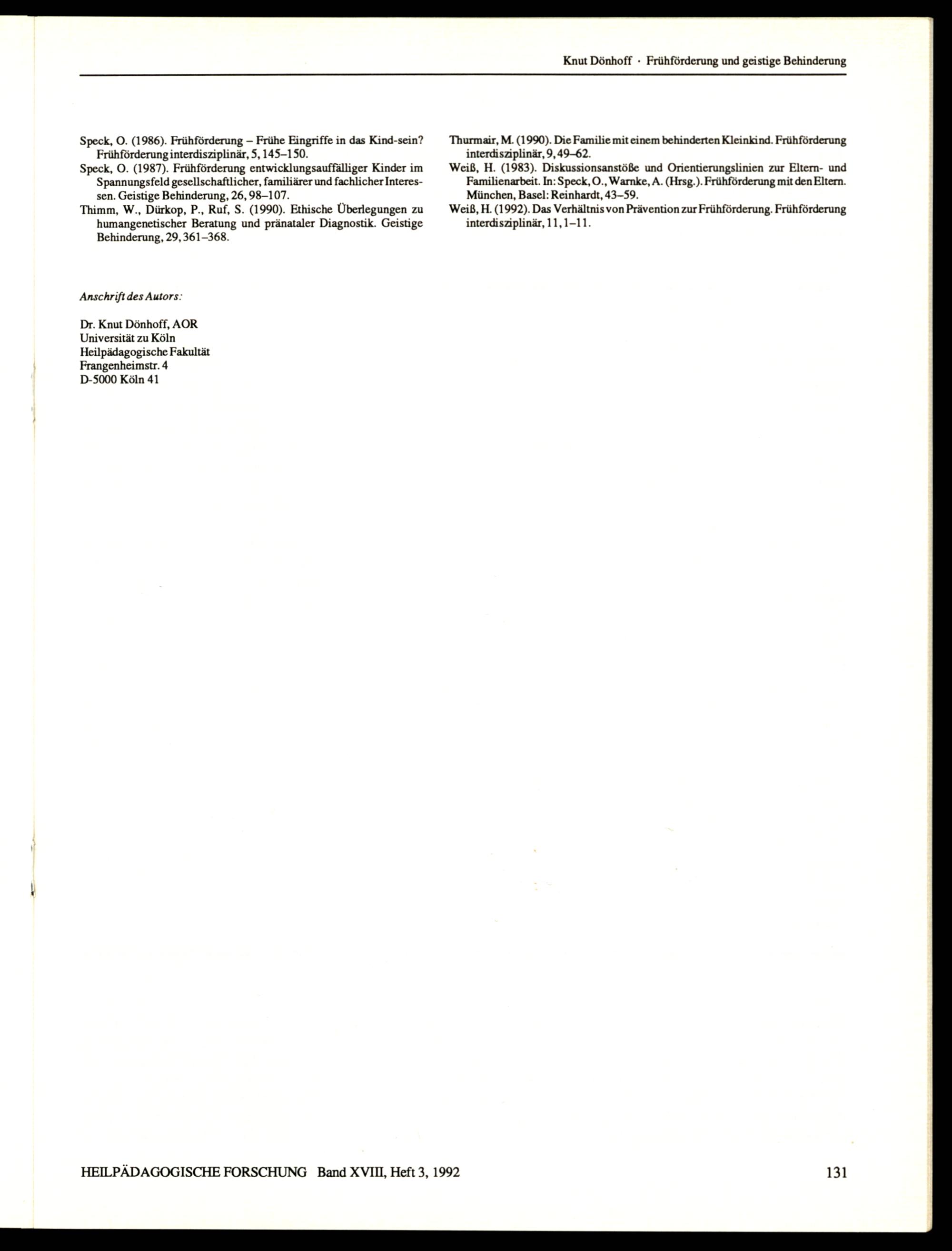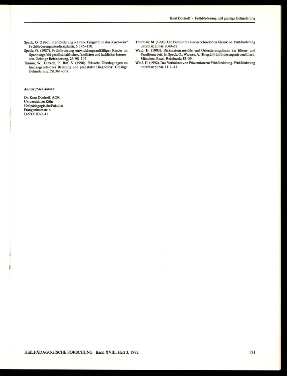 HEILPÄDAGOGISCHE FORSCHUNG Band XVII, Heft 3, 1992 1