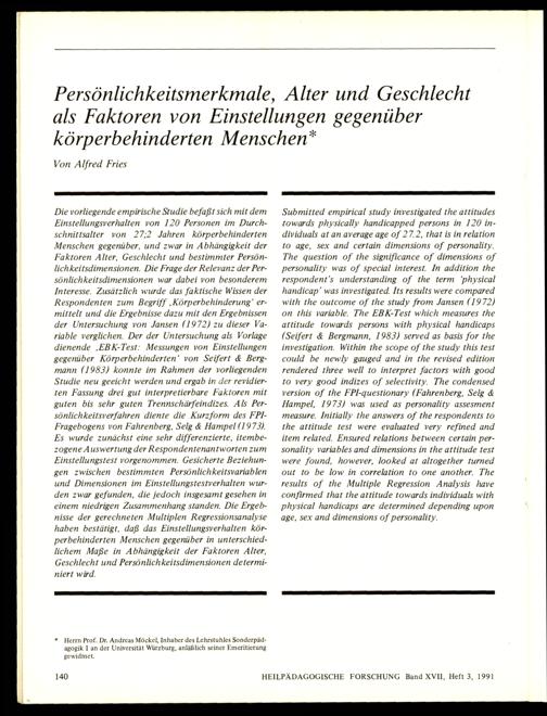 Persönlichkeitsmerkmale, Alter und Geschlecht als Faktoren von Einstellungen gegenüber körperbehinderten Menschen“