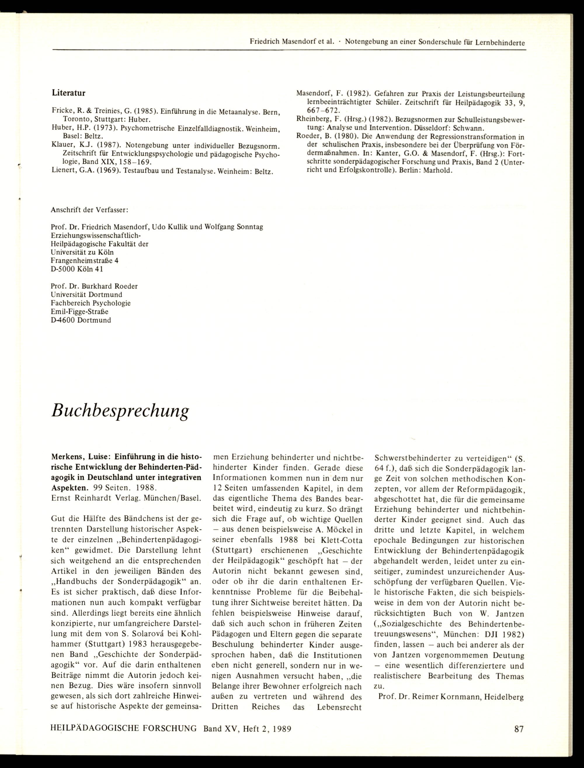 HEILPÄDAGOGISCHE FORSCHUNG Band XV, Heft 2, 1989