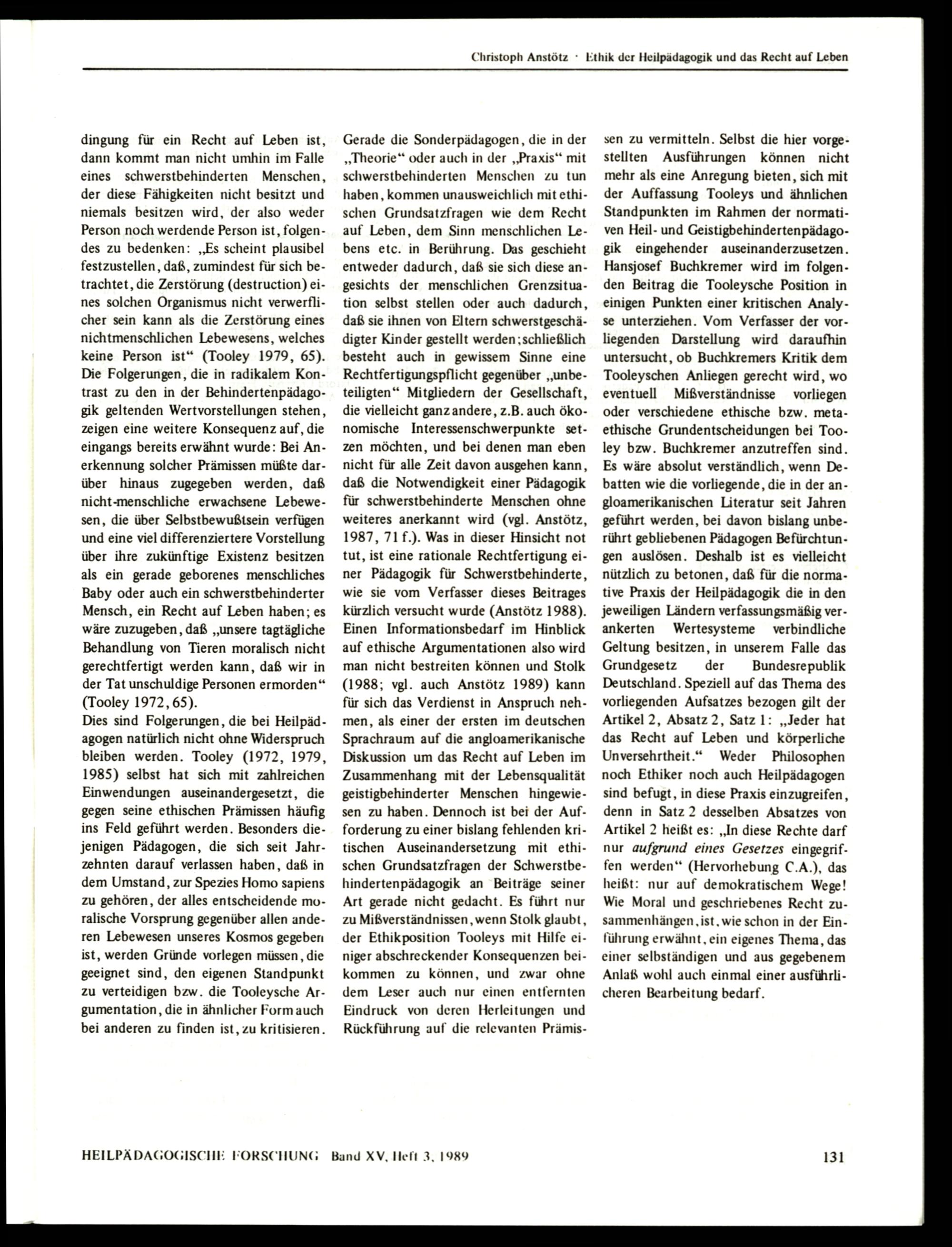 sen zu vermitteln. Selbst die hier vorgestellten Ausführungen können nicht mehr als eine Anregung bieten, sich mit der Auffassung Tooleys und ähnlichen Standpunkten im Rahmen der normativen Heil- und Geistigbehindertenpädagogik eingehender auseinanderzusetzen. Hansjosef Buchkremer wird im folgenden Beitrag die Tooleysche Position in einigen Punkten einer kritischen Analyse unterziehen. Vom Verfasser der vorliegenden Darstellung wird daraufhin untersucht, ob Buchkremers Kritik dem Tooleyschen Anliegen gerecht wird, wo eventuell Mißverständnisse vorliegen oder verschiedene ethische bzw. metaethische Grundentscheidungen bei Tooley bzw. Buchkremer anzutreffen sind. Es wäre absolut verständlich, wenn Debatten wie die vorliegende, die in der angloamerikanischen Literatur seit Jahren geführt werden, bei davon bislang unberührt gebliebenen Pädagogen Befürchtungen auslösen. Deshalb ist es vielleicht nützlich zu betonen, daß für die normative Praxis der Heilpädagogik die in den jeweiligen Ländern verfassungsmäßig verankerten Wertesysteme verbindliche Geltung besitzen, in unserem Falle das Grundgesetz der Bundesrepublik Deutschland. Speziell auf das Thema des vorliegenden Aufsatzes bezogen gilt der Artikel 2, Absatz 2, Satz l:„Jeder hat das Recht auf Leben und körperliche Unversehrtheit.“ Weder Philosophen noch Ethiker noch auch Heilpädagogen sind befugt, in diese Praxis einzugreifen, denn in Satz 2 desselben Absatzes von Artikel 2 heißt es:„In diese Rechte darf nur aufgrund eines Gesetzes eingegriffen werden‘(Hervorhebung C.A.), das heißt: nur auf demokratischem Wege! Wie Moral und geschriebenes Recht zusammenhängen ‚ist, wie schon in der Einführung erwähnt, ein eigenes Thema, das einer selbständigen und aus gegebenem Anlaß wohl auch einmal einer ausführlicheren Bearbeitung bedarf.