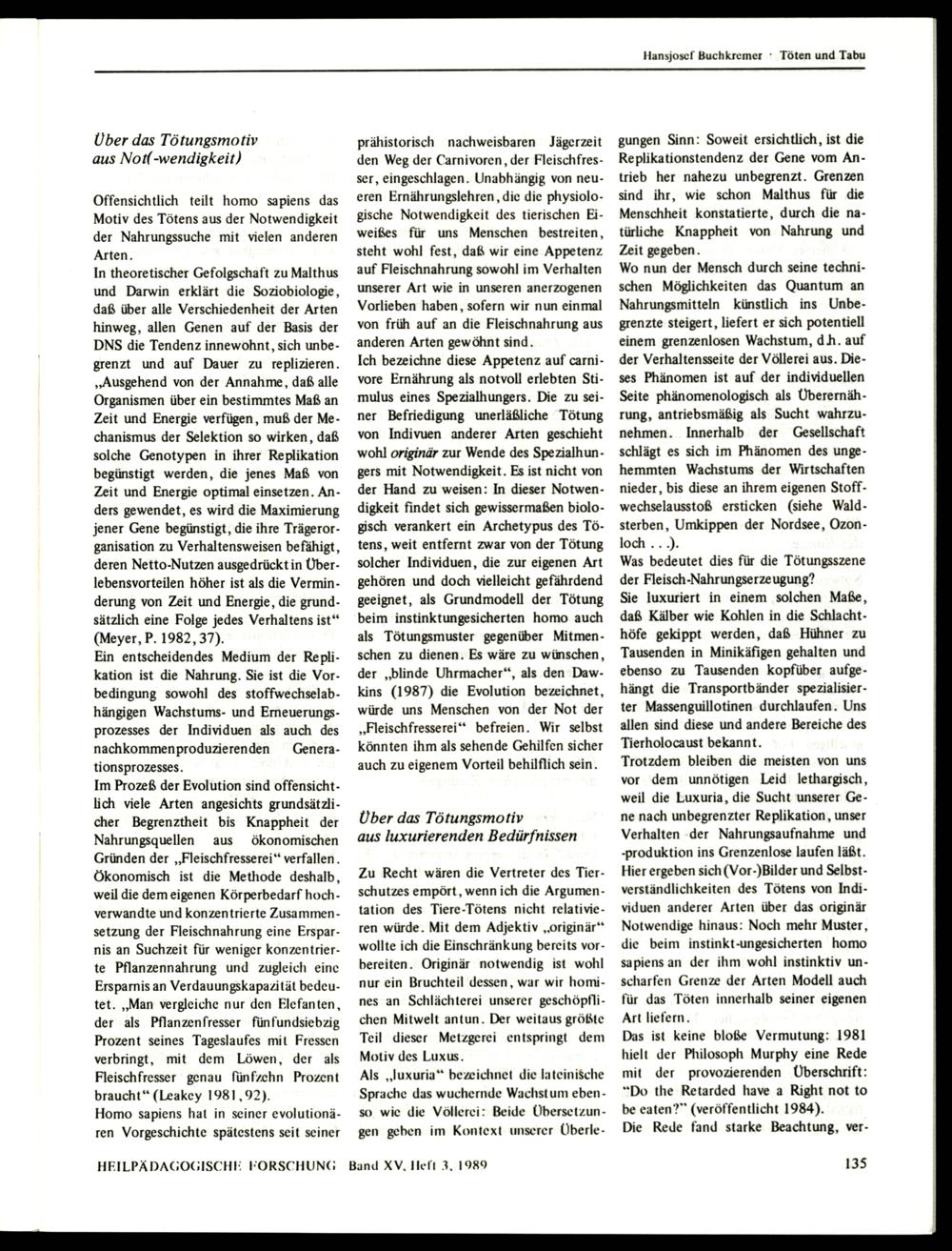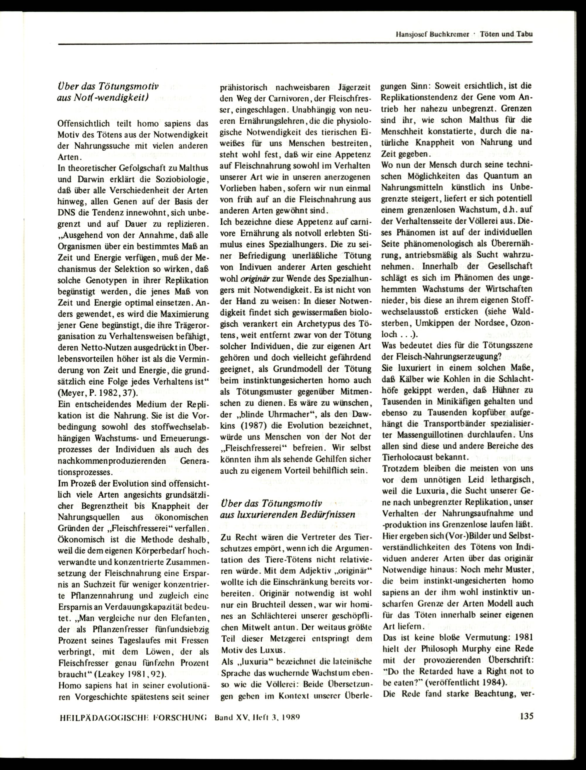 Ich bezeichne diese Appetenz auf carnivore Ernährung als notvoll erlebten Stimulus eines Spezialhungers. Die zu seiner Befriedigung unerläßliche Tötung von Indivuen anderer Arten geschieht wohl originär zur Wende des Spezialhungers mit Notwendigkeit. Es ist nicht von der Hand zu weisen: In dieser Notwendigkeit findet sich gewissermaßen biologisch verankert ein Archetypus des Tötens, weit entfernt zwar von der Tötung solcher Individuen, die zur eigenen Art gehören und doch vielleicht gefährdend geeignet, als Grundmodell der Tötung beim instinktungesicherten homo auch als Tötungsmuster gegenüber Mitmenschen zu dienen. Es wäre zu wünschen, der„blinde Uhrmacher“, als den Dawkins(1987) die Evolution bezeichnet, würde uns Menschen von der Not der „Fleischfresserei‘‘ befreien. Wir selbst könnten ihm als sehende Gehilfen sicher auch zu eigenem Vorteil behilflich sein.