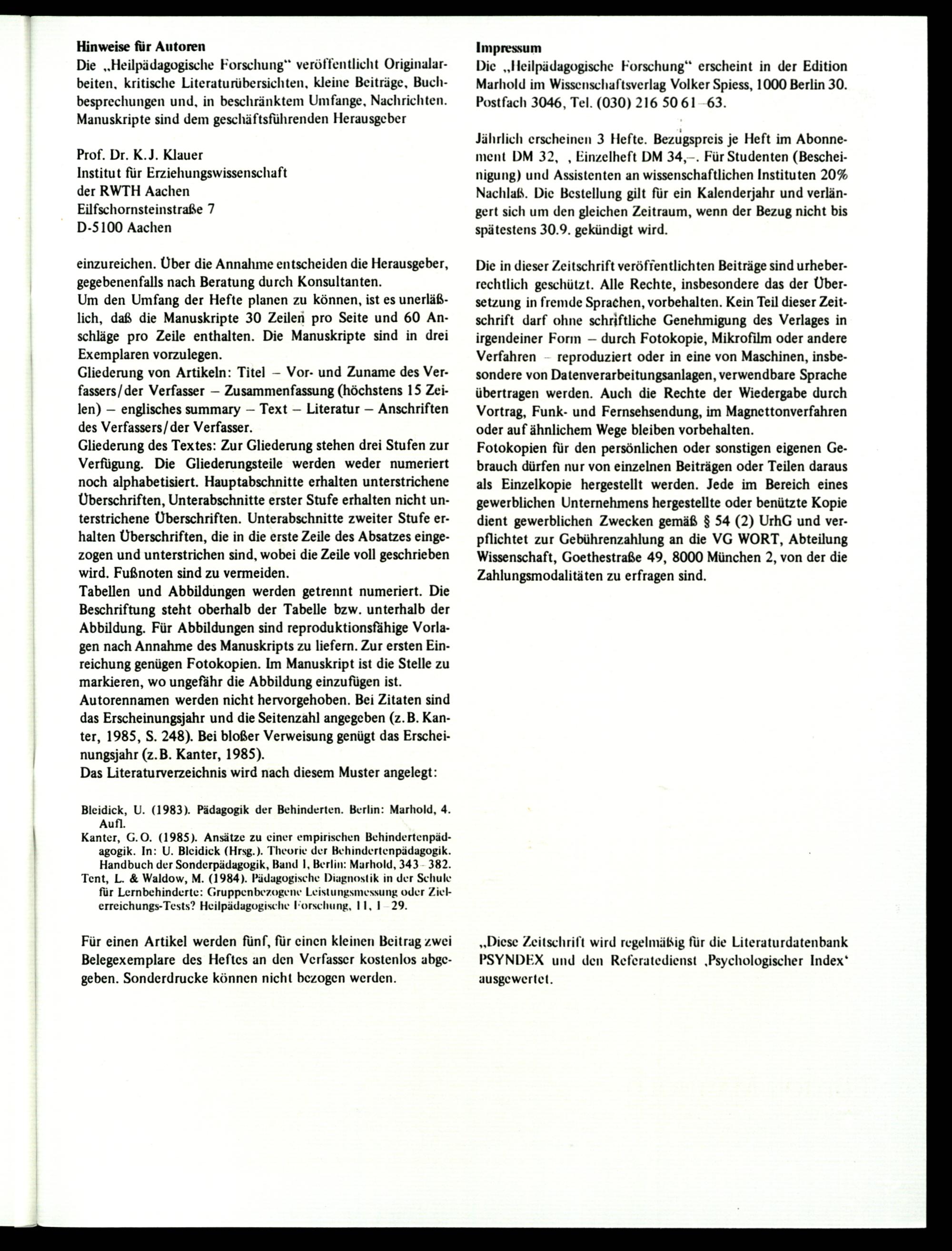 Die„Heilpädagogische Forschung‘ erscheint in der Edition Marhold im Wissenschaftsverlag Volker Spiess, 1000 Berlin 30. Postfach 3046, Tel.(030) 216 50 61-63.