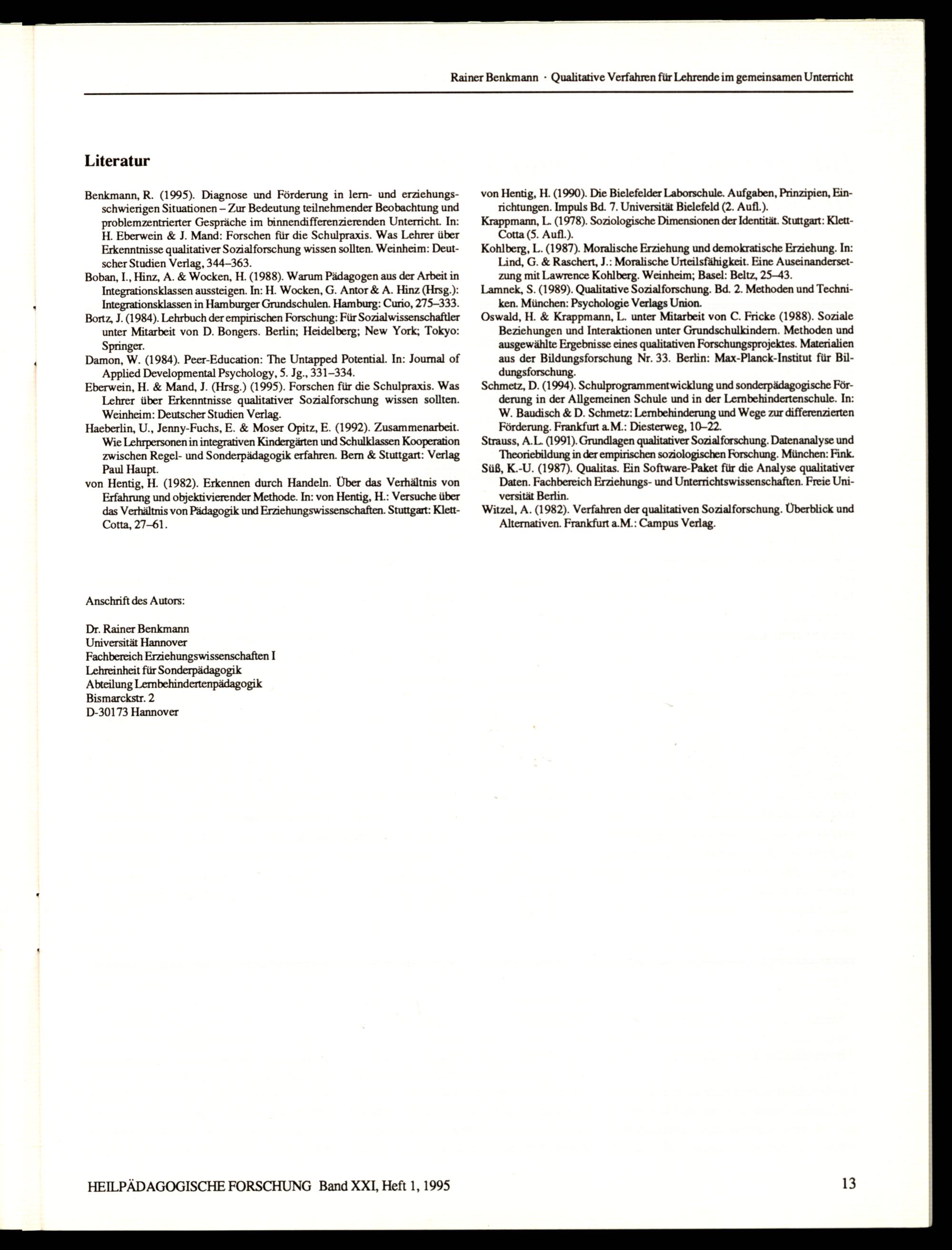HEILPÄDAGOGISCHE FORSCHUNG Band XXI, Heft 1, 1995