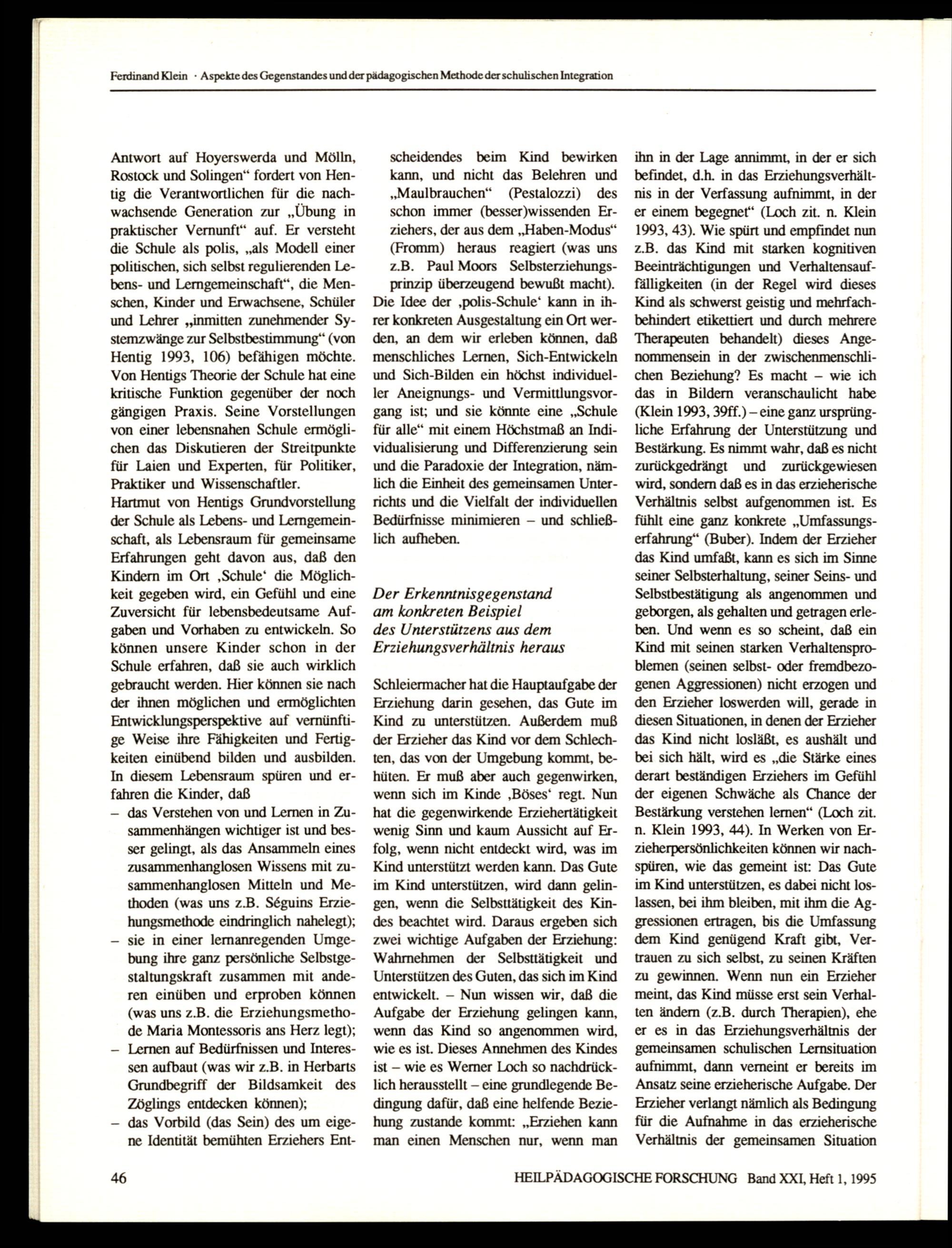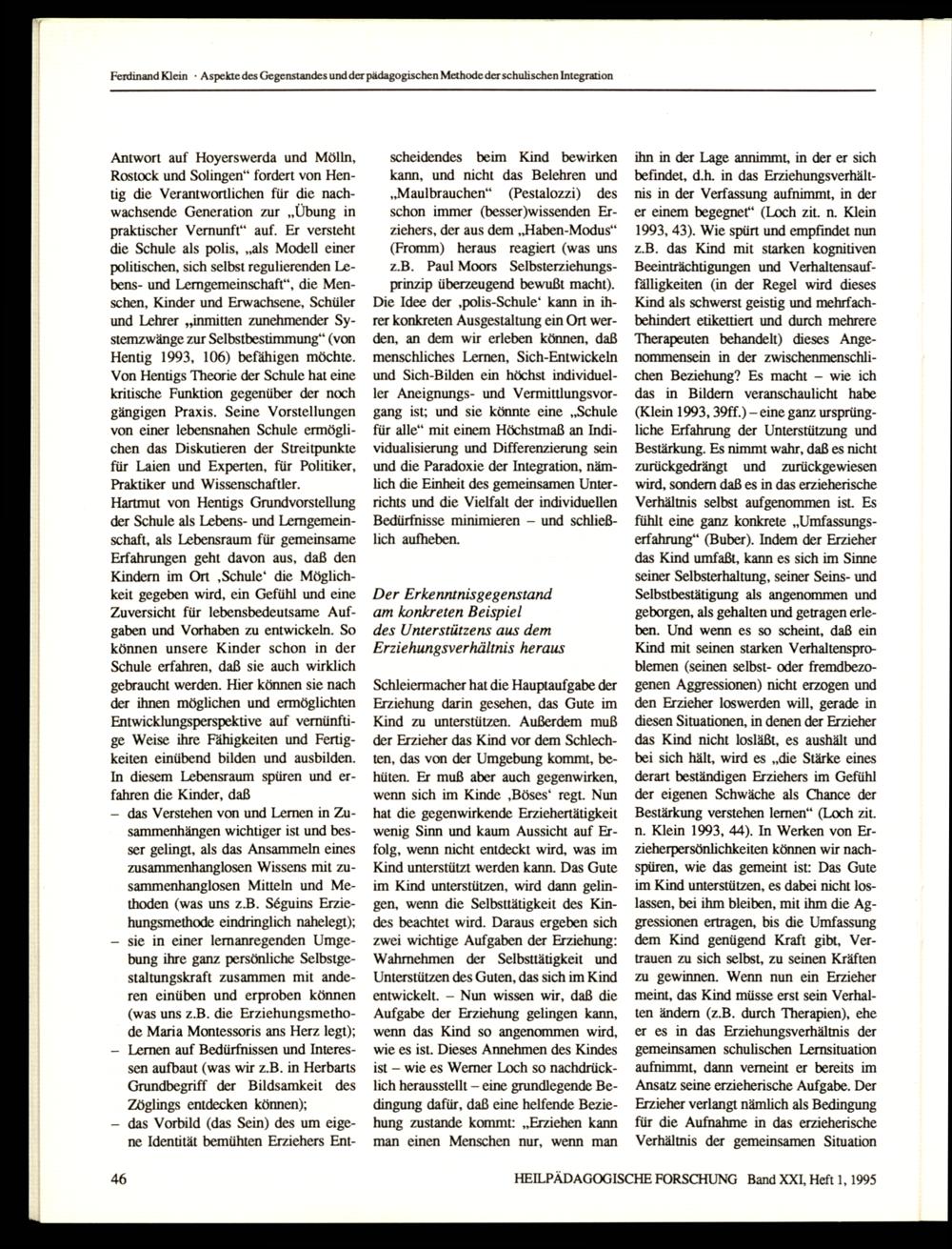 HEILPÄDAGOGISCHE FORSCHUNG Band XXI, Heft 1, 1995