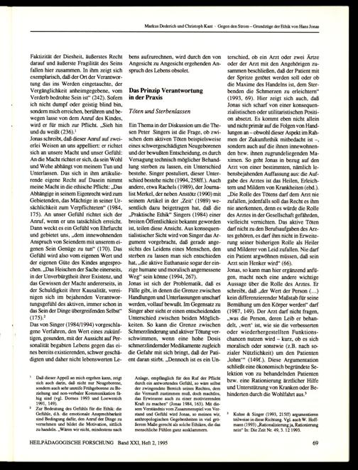terschied, ob ein Arzt oder zwei Ärtze oder der Arzt mit den Angehörigen zusammen beschließen, daß der Patient mit der Spritze getötet werden soll oder ob die Maxime des Handelns ist, dem Sterbenden die Schmerzen zu erleichtern“ (1993, 69). Hier zeigt sich auch, daß Jonas sich scharf von einer konsequenzialistischen oder utilitaristischen Position absetzt. Es kommt eben nicht allein und nicht primär auf die Folgen von Handlungen an— obwohl dieser Aspekt im Rahmen der Zukunftethik mitbedacht ist—, sondern auch auf die ihnen innewohnenden bzw. ihnen zugrundeliegenden Maximen. So geht Jonas in bezug auf den Arzt von einer bestimmten, nämlich lebensbejahenden Auffassung aus: die Aufgabe des Arztes ist das Heilen, Erleichtern und Mildern von Krankheiten(ebd.). „Die Rolle des Tötens darf dem Arzt nie zufallen, jedenfalls soll das Recht es ihm nie anerkennen, denn es würde die Rolle des Arztes in der Gesellschaft gefährden, vielleicht vernichten. Das aktive Töten darf nicht zu den Berufsaufgaben des Arztes gehören, es darf ihm nicht in Erweiterung seiner bisherigen Rolle als Heiler und Milderer von Leid zufallen. Nie darf ein Patient argwöhnen müssen, daß sein Arzt sein Henker wird“(66).