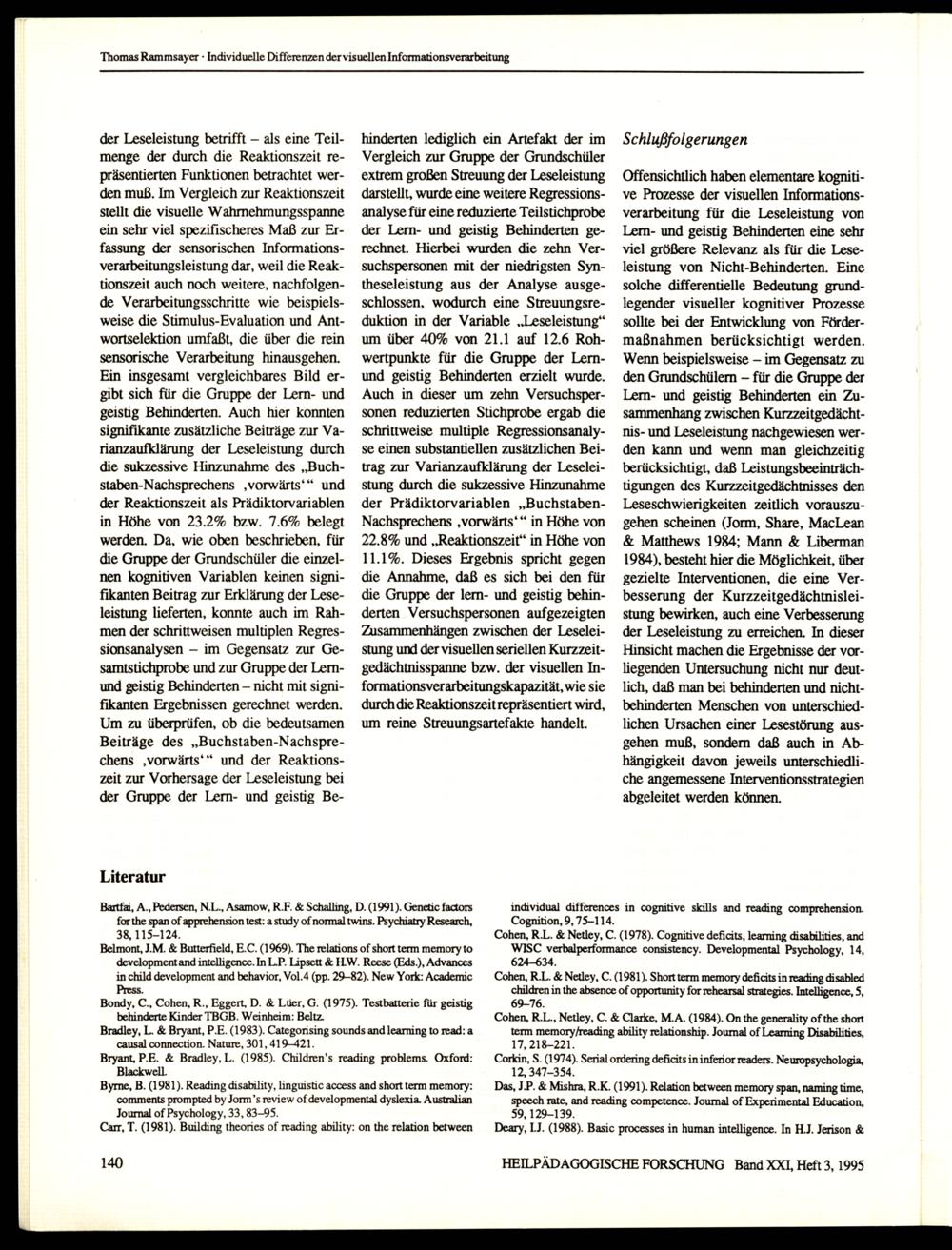 HEILPÄDAGOGISCHE FORSCHUNG Band XXI, Heft 3, 1995