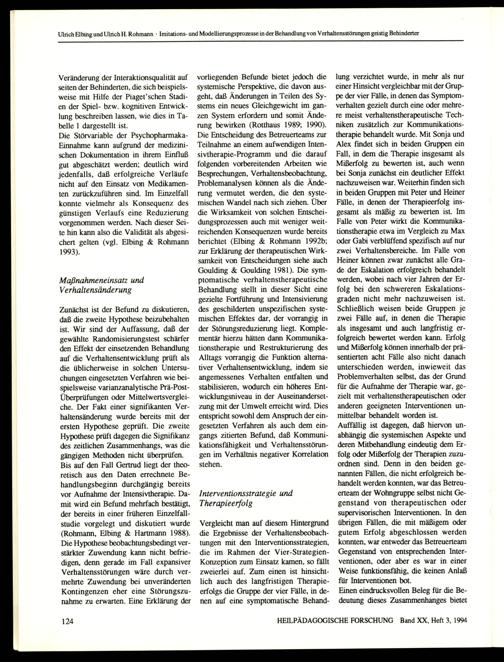 vorliegenden Befunde bietet jedoch die systemische Perspektive, die davon ausgeht, daß Änderungen in Teilen des Systems ein neues Gleichgewicht im ganzen System erfordern und somit Änderung bewirken(Rotthaus 1989; 1990). Die Entscheidung des Betreuerteams zur Teilnahme an einem aufwendigen Intensivtherapie-Programm und die darauf folgenden vorbereitenden Arbeiten wie Besprechungen, Verhaltensbeobachtung, Problemanalysen können als die Änderung vermutet werden, die den systemischen Wandel nach sich ziehen. Über die Wirksamkeit von solchen Entscheidungsprozessen auch mit weniger weitreichenden Konsequenzen wurde bereits berichtet(Elbing& Rohmann 1992b; zur Erklärung der therapeutischen Wirksamkeit von Entscheidungen siehe auch Goulding& Goulding 1981). Die symptomatische verhaltenstherapeutische Behandlung stellt in dieser Sicht eine gezielte Fortführung und Intensivierung des geschilderten unspezifischen systemischen Effektes dar, der vorrangig in der Störungsreduzierung liegt. Komplementär hierzu hätten dann Kommunikationstherapie und Restrukturierung des Alltags vorrangig die Funktion alternativer Verhaltensentwicklung, indem sie angemessenes Verhalten entfalten und stabilisieren, wodurch ein höheres Entwicklungsniveau in der Auseinandersetzung mit der Umwelt erreicht wird. Dies entspricht sowohl dem Anspruch der eingesetzten Verfahren als auch dem eingangs zitierten Befund, daß Kommunikationsfähigkeit und Verhaltensstörungen im Verhältnis negativer Korrelation stehen.