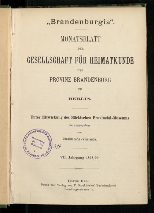 Monatsblatt der Gesellschaft für Heimatkunde und Heimatschutz in der Mark Brandenburg, Berlin / Brandenburgia ; unter Mitwirkung des Märkischen Museums hrsg. vom Gesellschafts-Vorstande