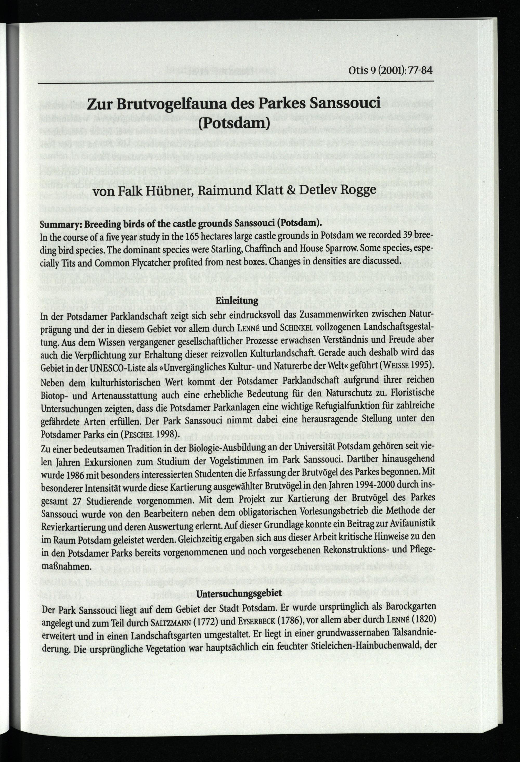 Hübner, Falk/ Klatt, Raimund/ Rogge, Detlev, Zur Brutvogelfauna des Prakes Sanssouci...