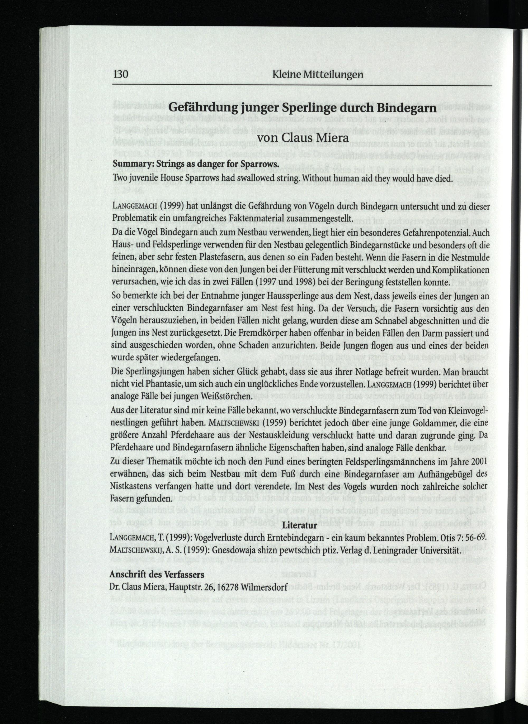 Miera, CLaus, Gefährdung junger Sperlinge durch Bindegarn