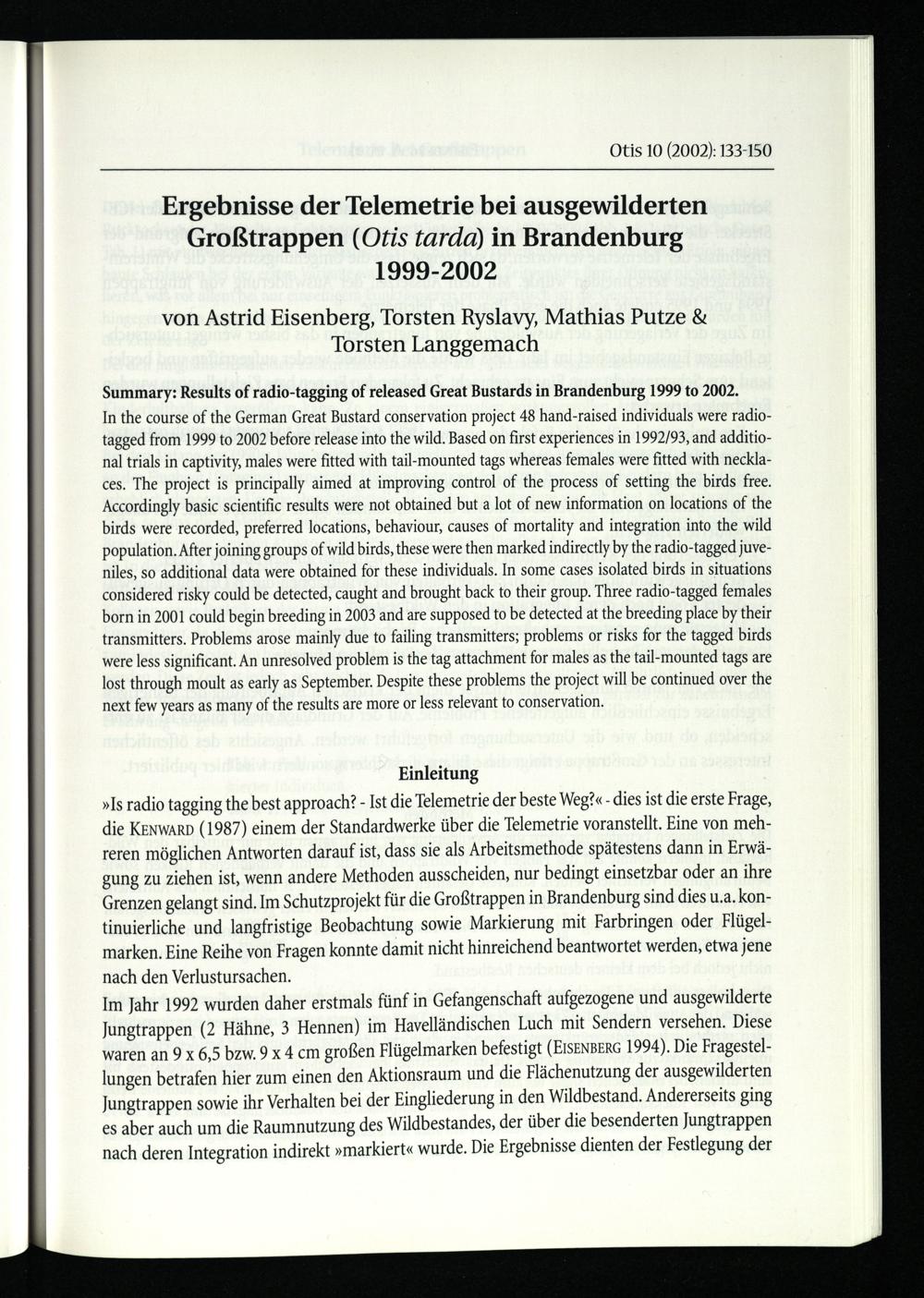 Eisenberg, Astrid (u.a.), Ergebnisse der Telemetrie bei ausgewilderten Großtrappen...