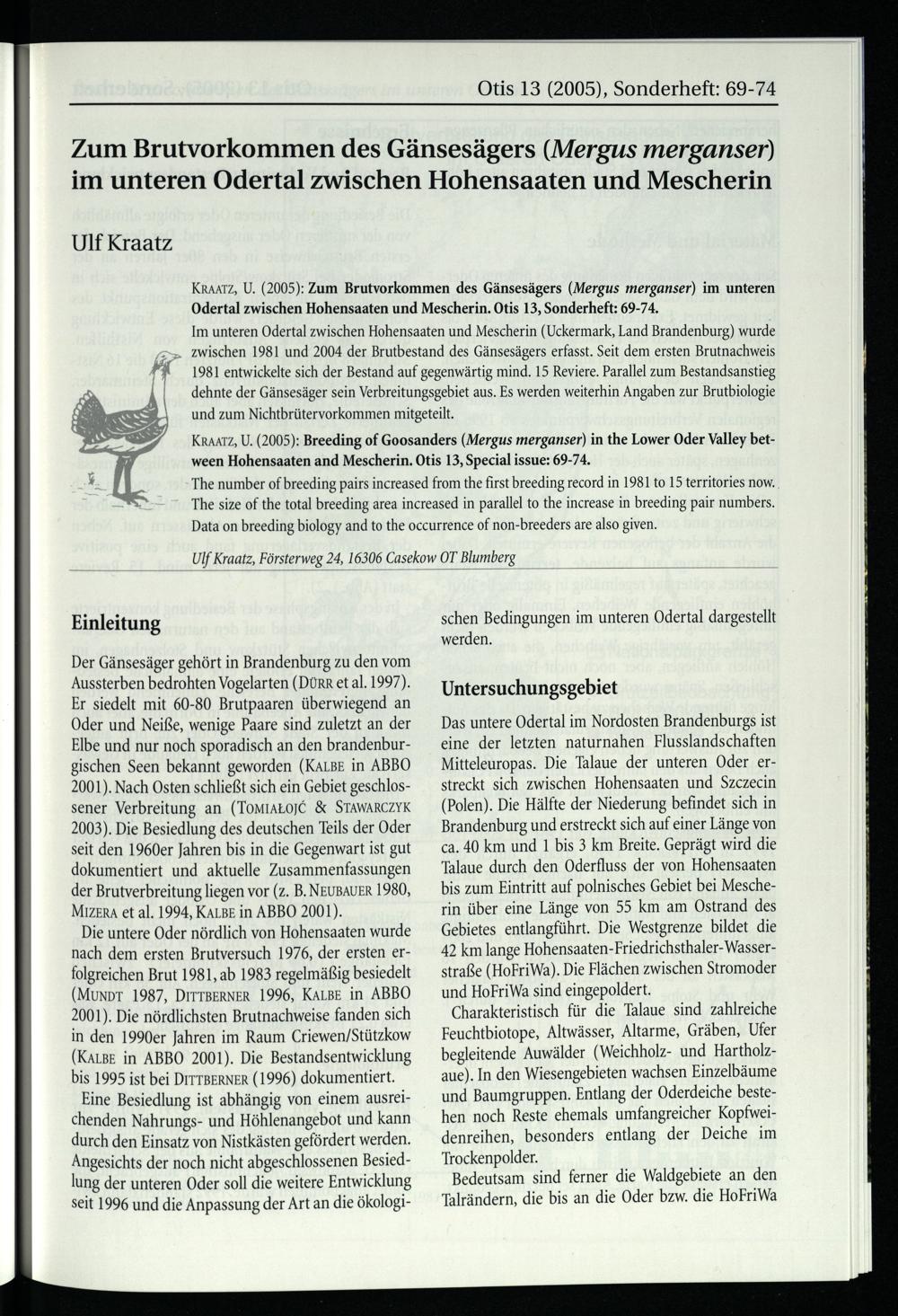 Kraatz, Ulf, Zum Brutvorkommen des Gänsesängers (Mergus merganser) im unteren Odertal...