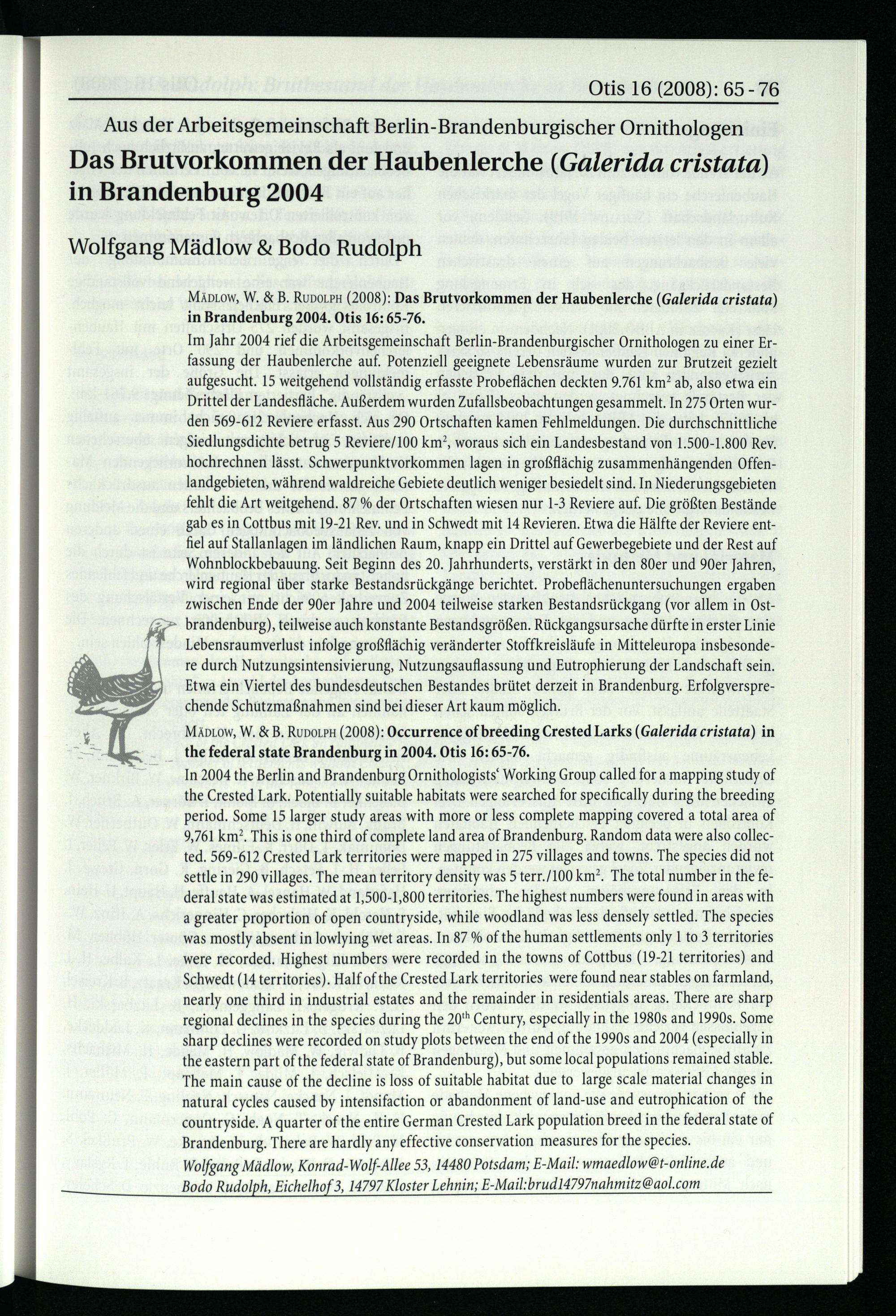 Mädlow, Wolfgang/ Rudolph, Bodo, Das Brutvorkommen der Haubenlerche (Galerida cristata)...