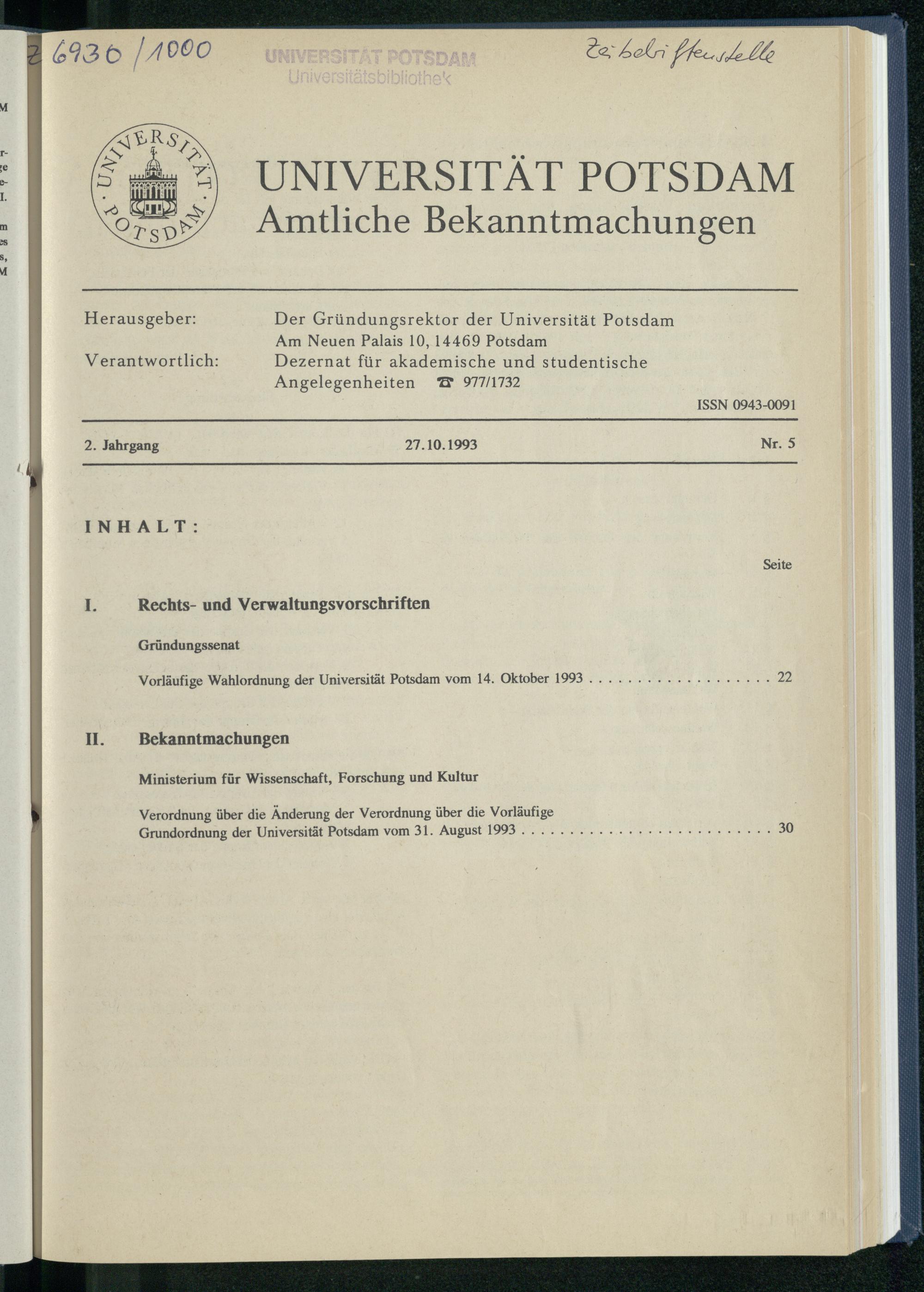 Verordnung über die Änderung der Verordnung über die Vorläufige Grundordnung der Universität Potsdam