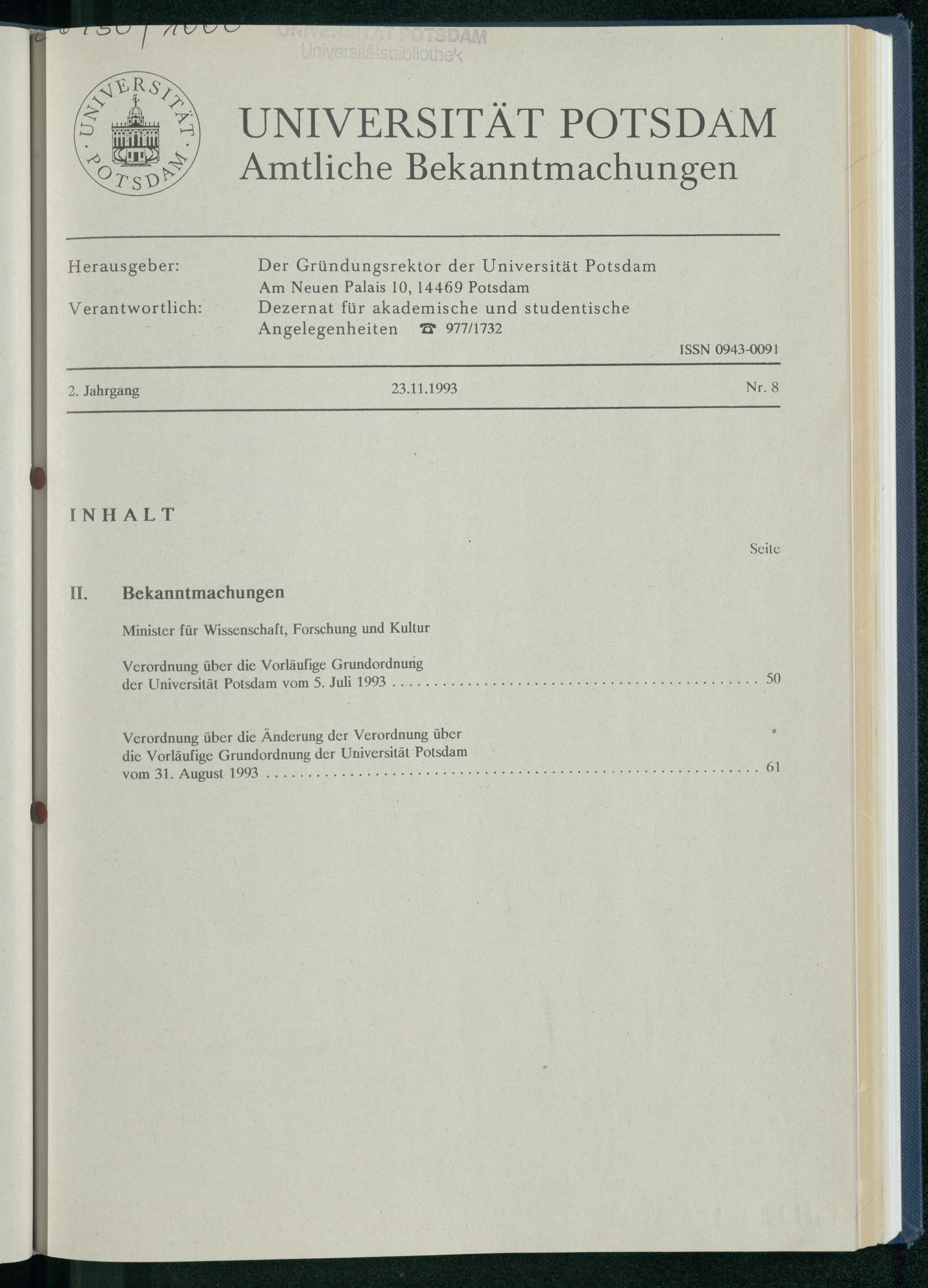 Verordnung über die Vorläufige Grundordnung der Universität Potsdam