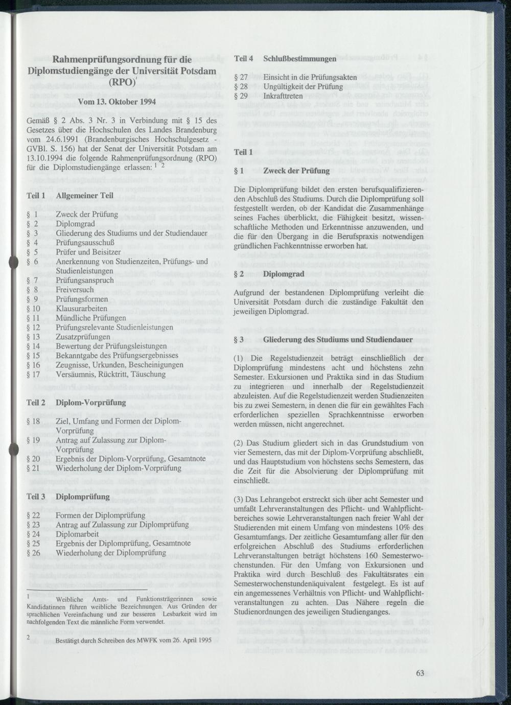 Rahmenprüfungsordnung für die Diplomstudiengänge der Universität Potsdam (RPO)