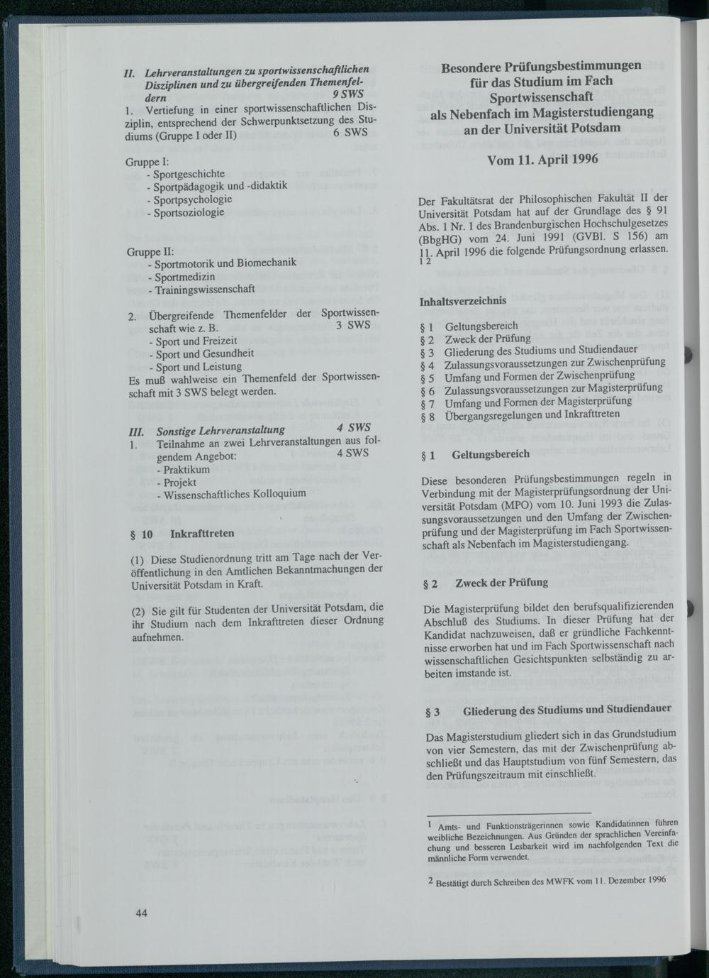 Besondere Prüfungsbestimmungen für das Studium im Fach Stortwissenschaft als nebenfach...