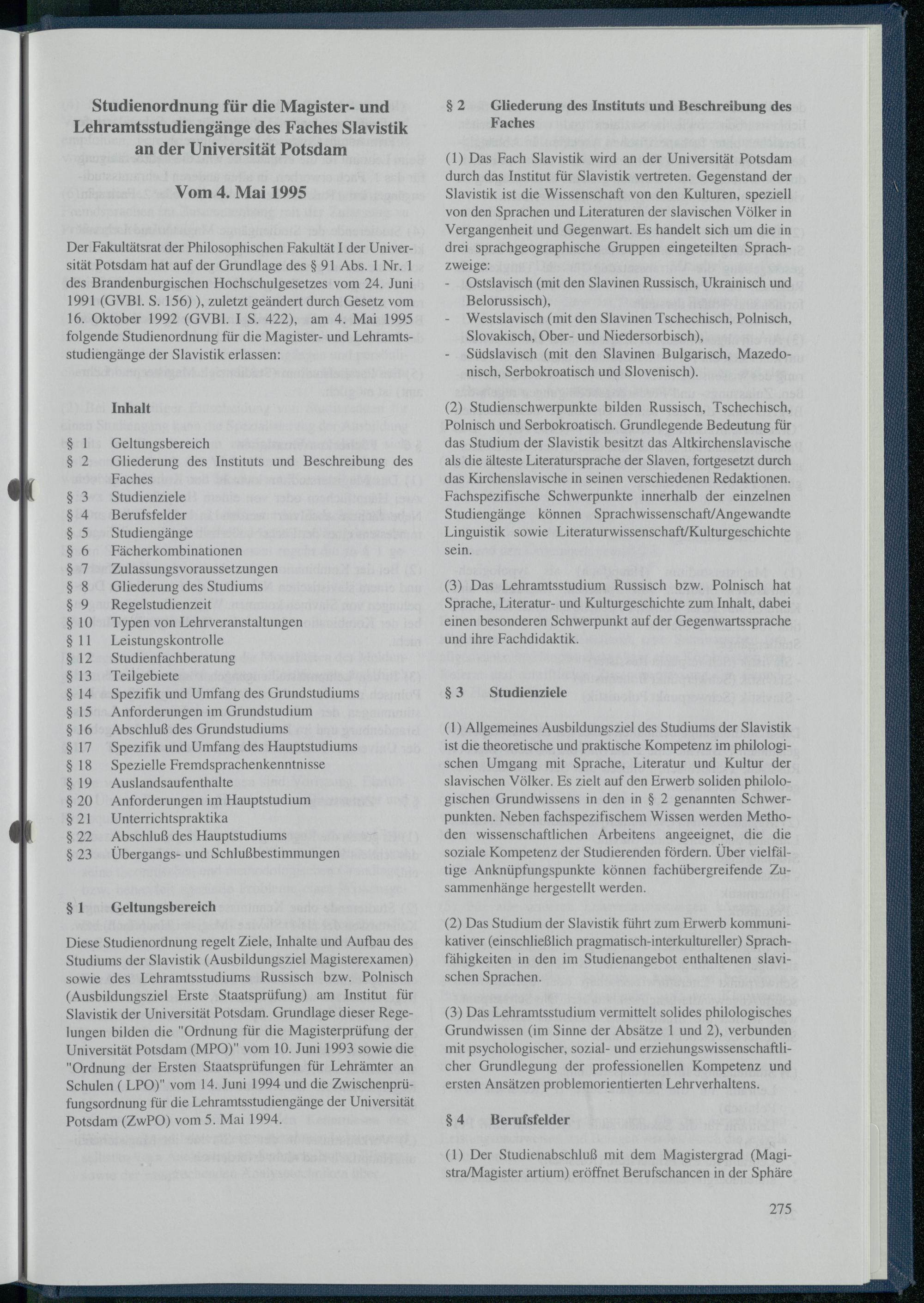 Studienordnung für die Magister- und Lehramtsstudiengänge des Fache Slavistik an...