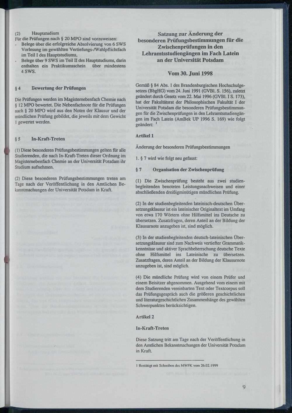 Satzung zur Änderung der besonderen Prüfungsbestimmungen für die Zwischenprüfungen...
