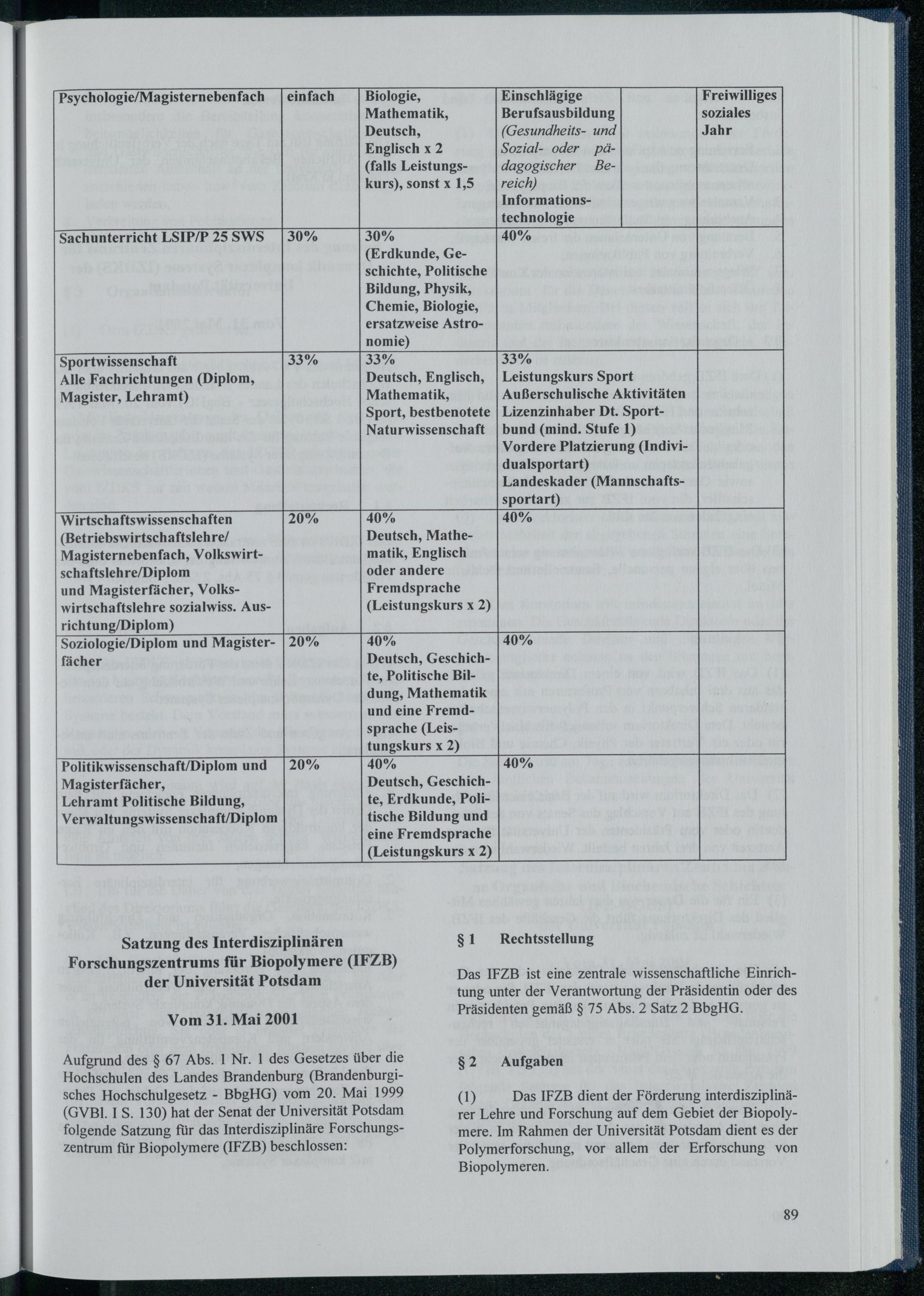 Satzung des Interdisziplinären Forschungszentrums für Biopolymere (IFZB) der Universität...