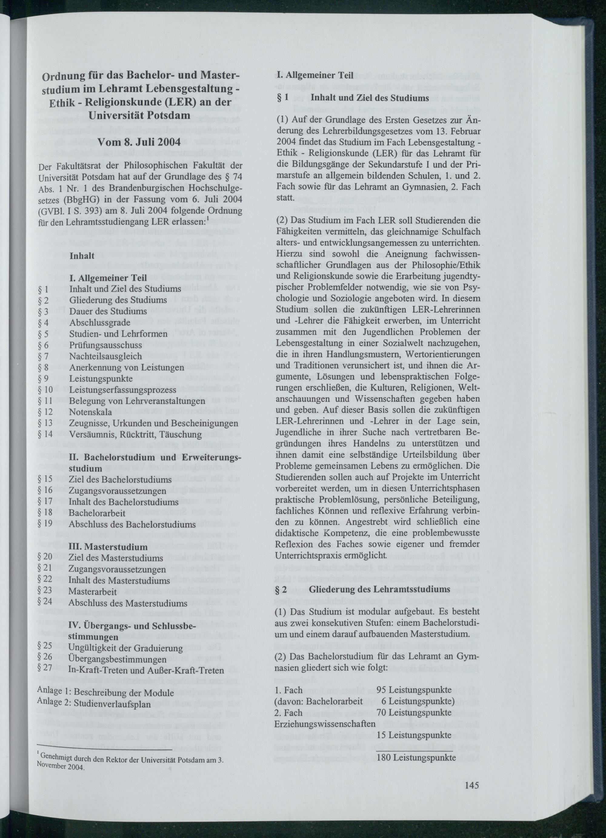 Ordnung für das Bachelor- und Masterstudium im Lehramt Lebensgestaltung - Ethik -...