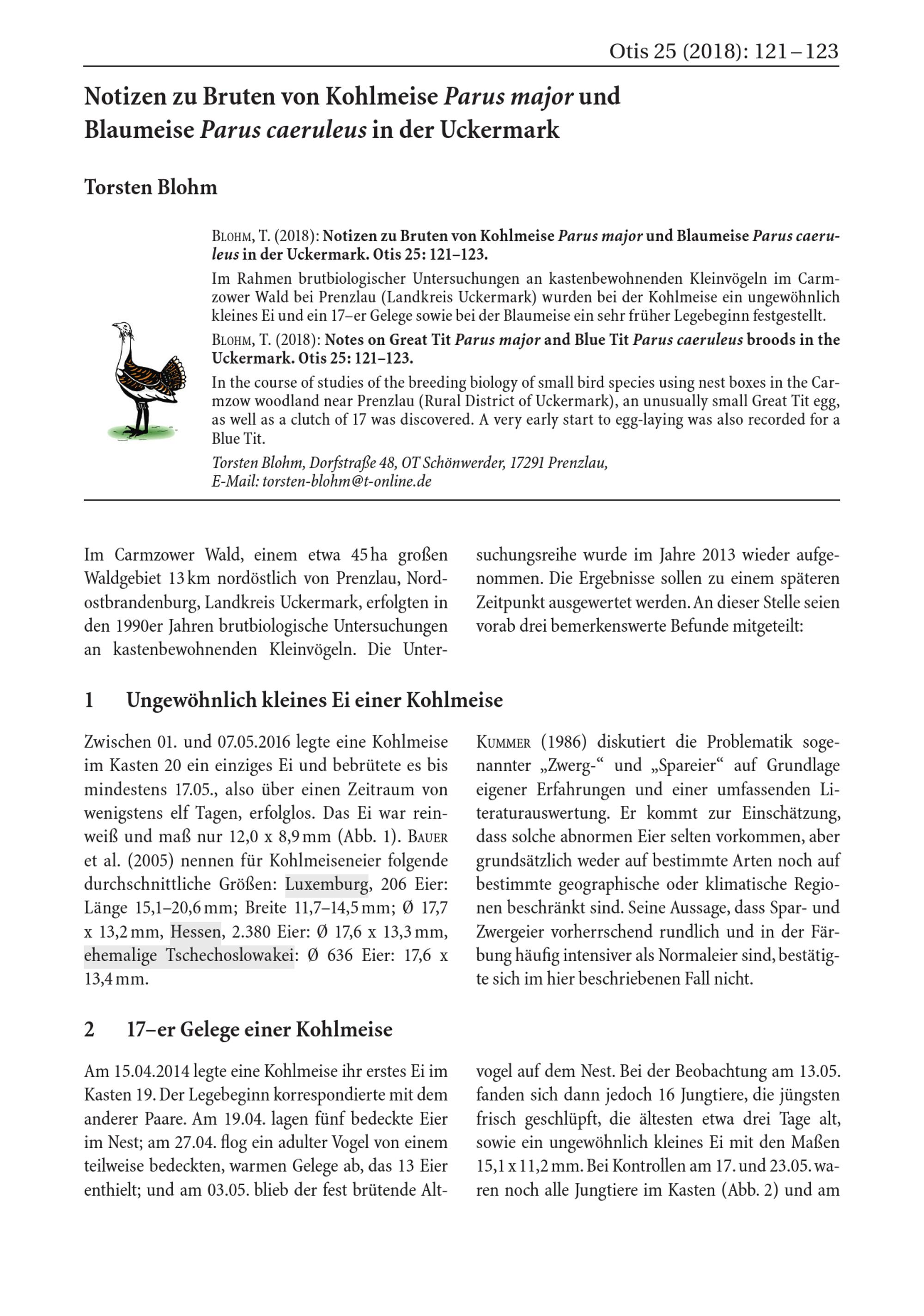 Torsten Blohm: Notizen zu Bruten von Kohlmeise Parus major und Blausmeise Parus caeruleus...
