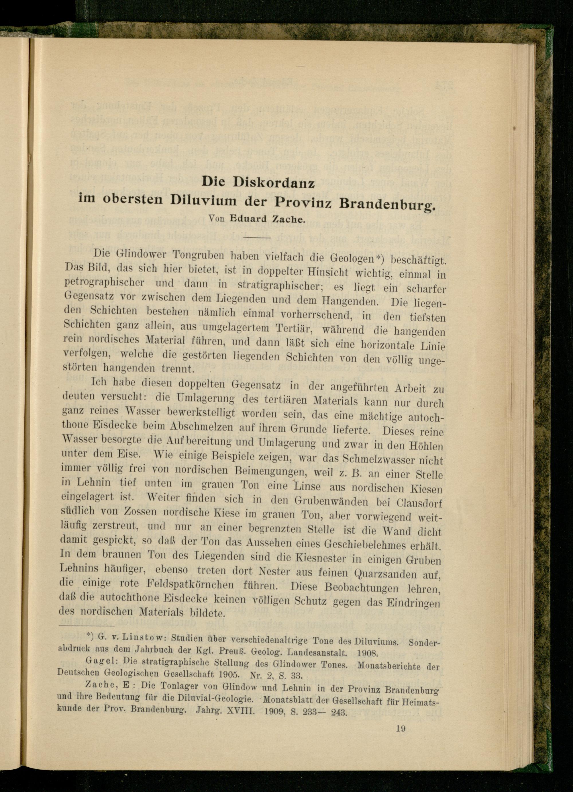 Eduard Zache: Die Diskordanz im obersten Diluvium der Provinz Brandenburg.