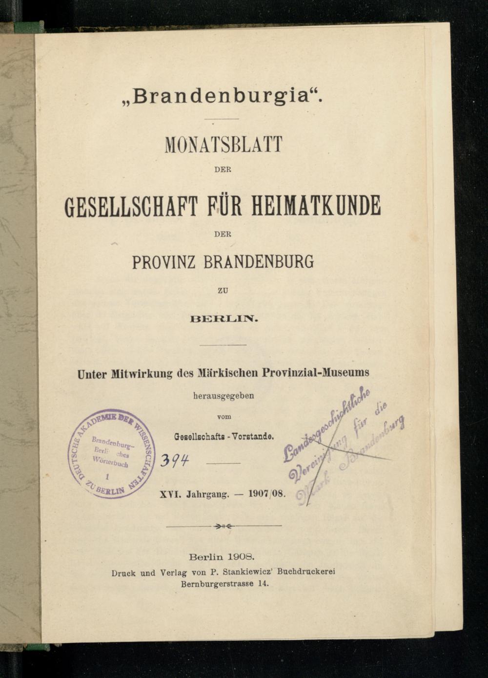Monatsblatt der Gesellschaft für Heimatkunde und Heimatschutz in der Mark Brandenburg,...