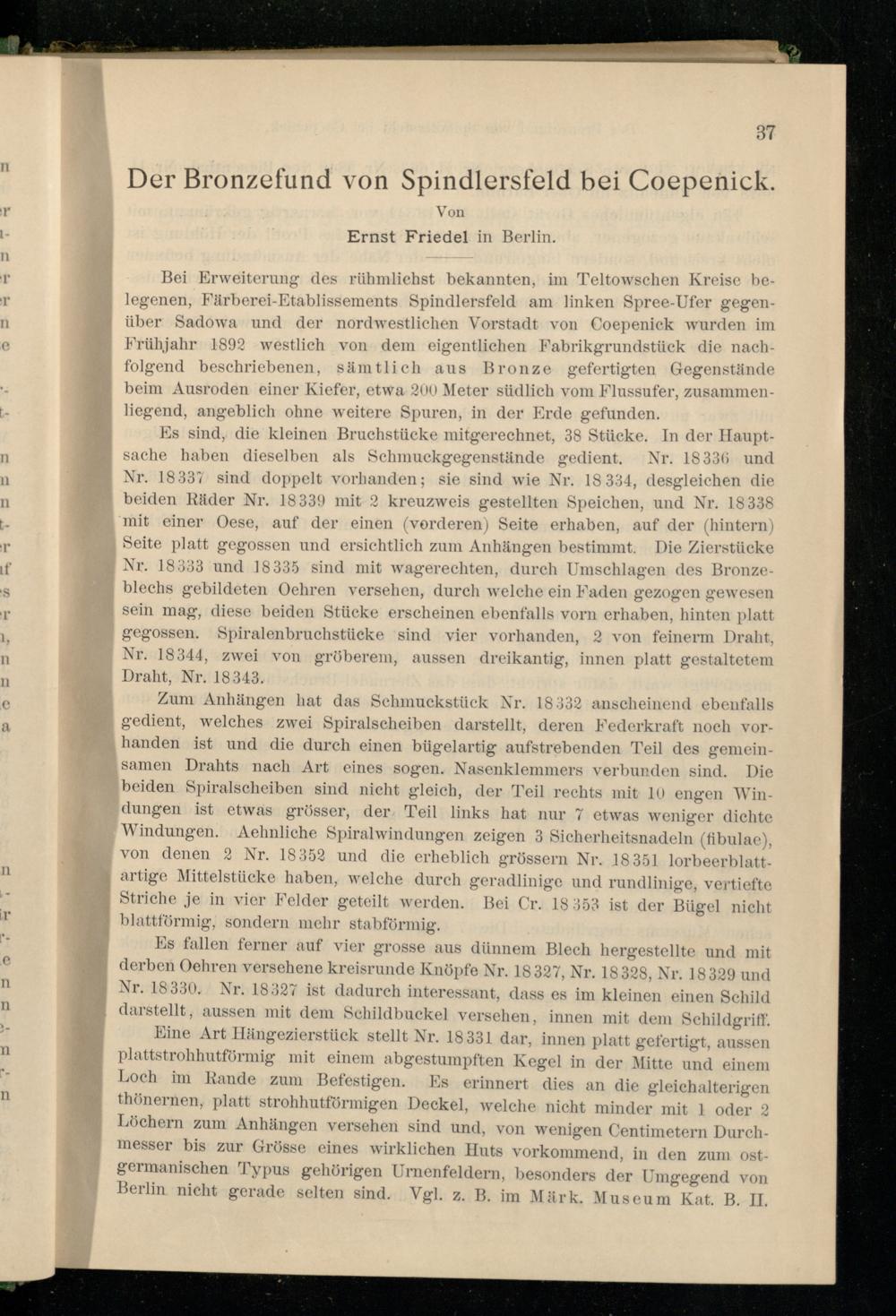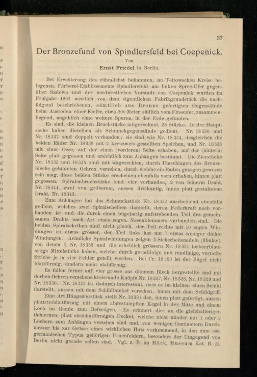 Ernst Friedel: Der Bronzefund von Spindlersfeld bei Coepenick.