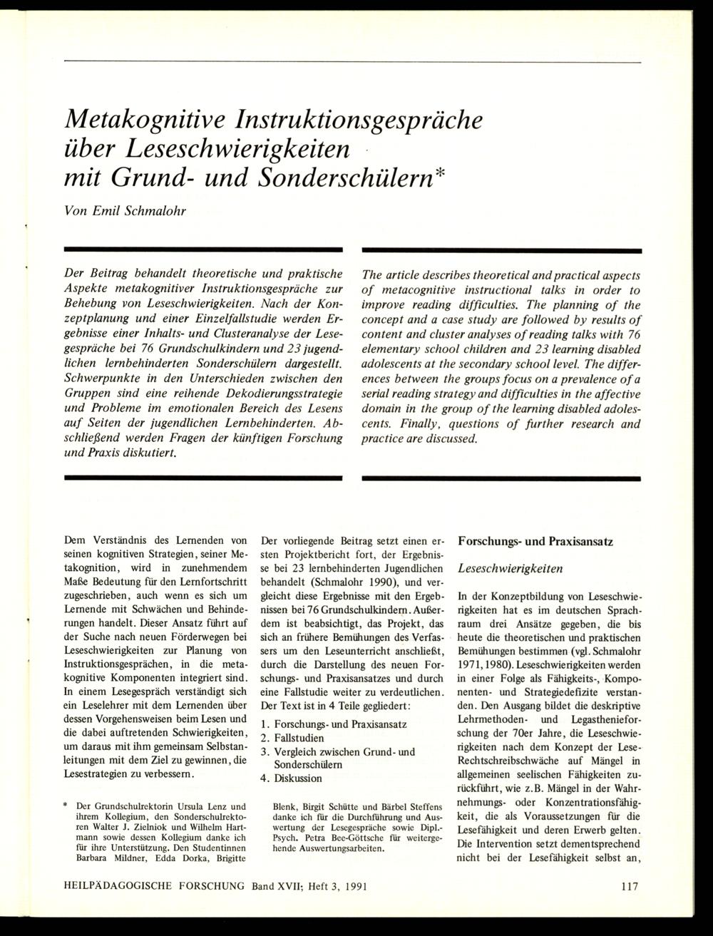 Metakognitive Instruktionsgespräche über Leseschwierigkeiten mit Grund- und Sond...