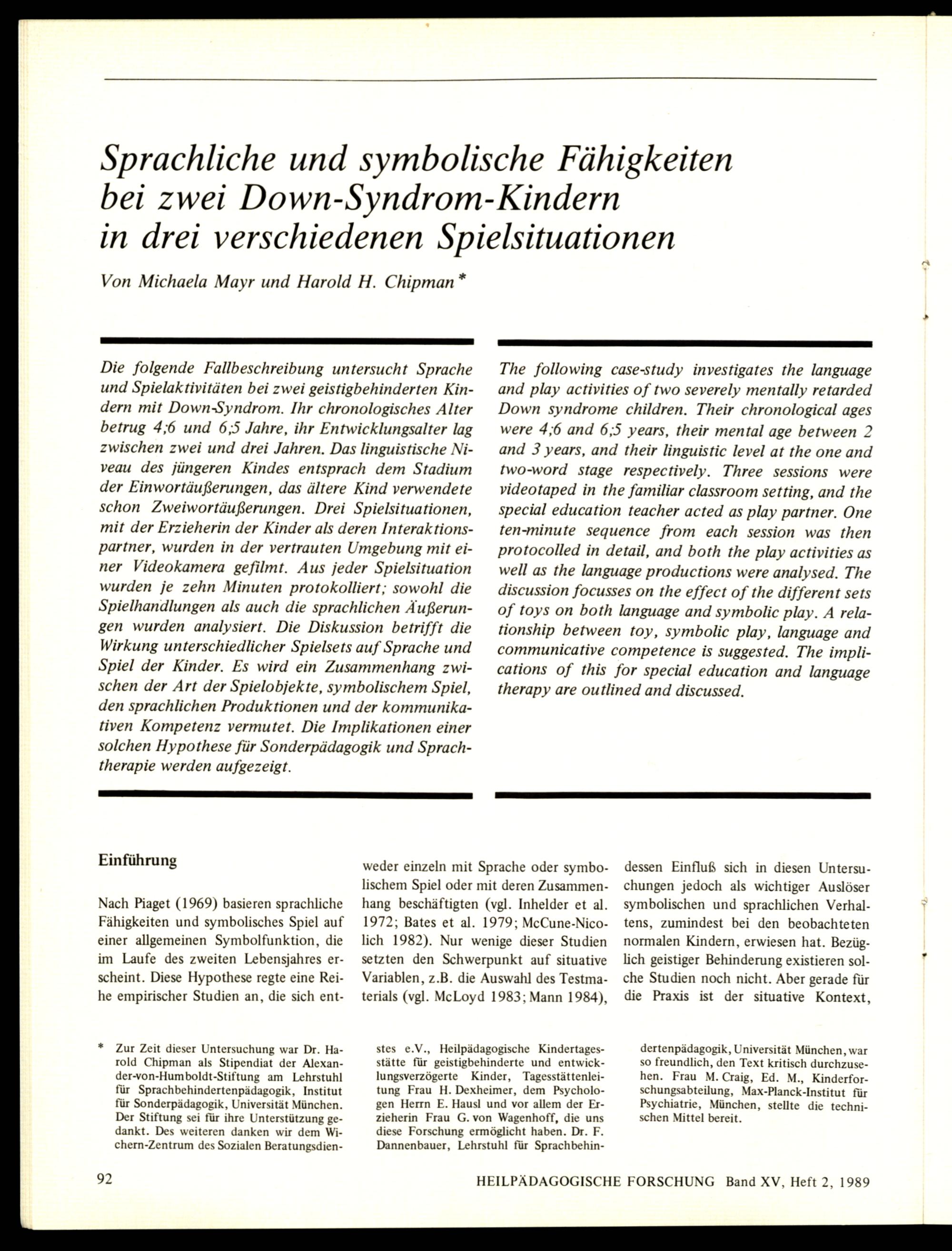 Sprachliche und symbolische Fähigkeiten bei zwei Down-Syndrom-Kindern in drei verschiedenen...