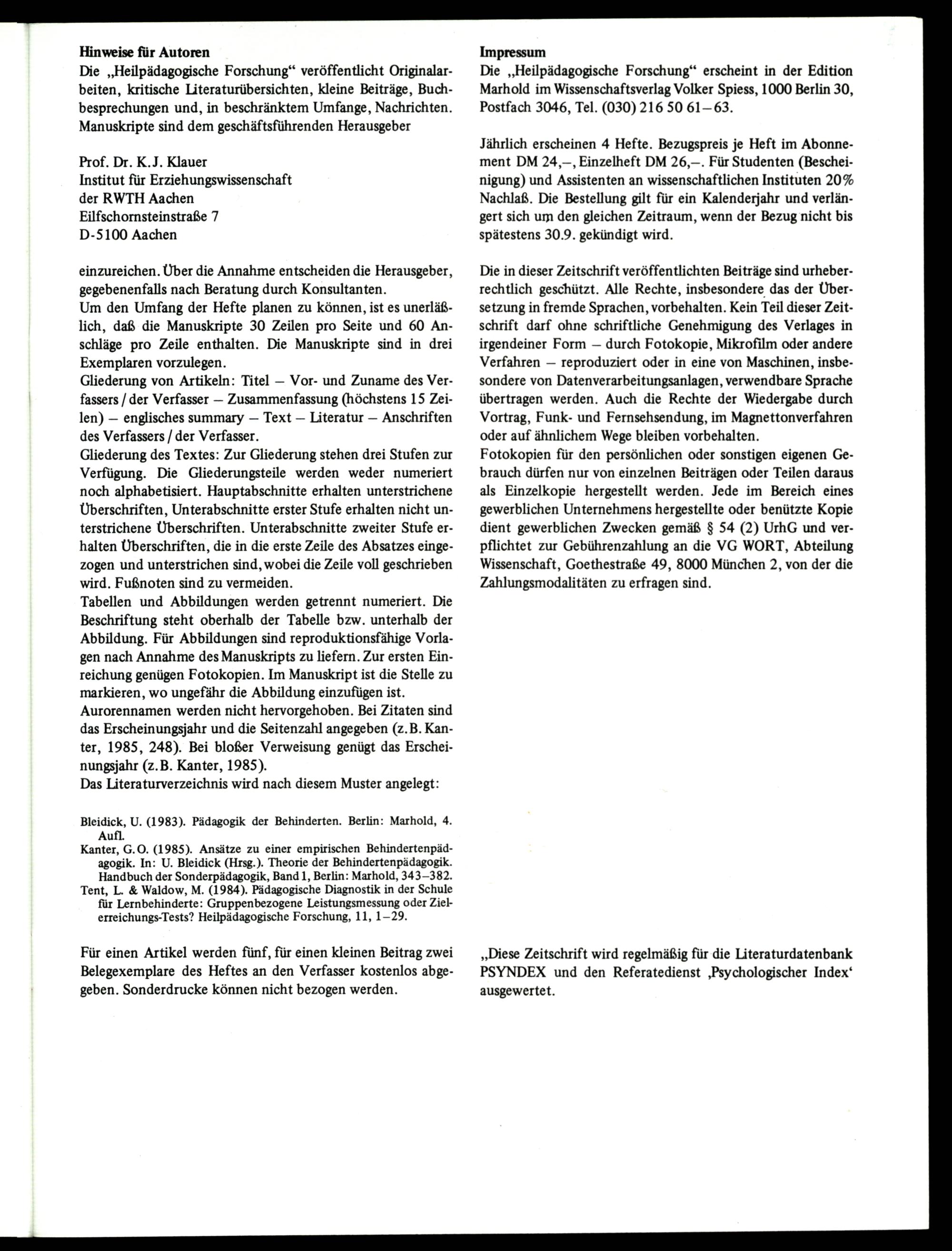 Heilpädagogische Forschung : Zeitschrift für Pädagogik und Psychologie bei Behinderungen