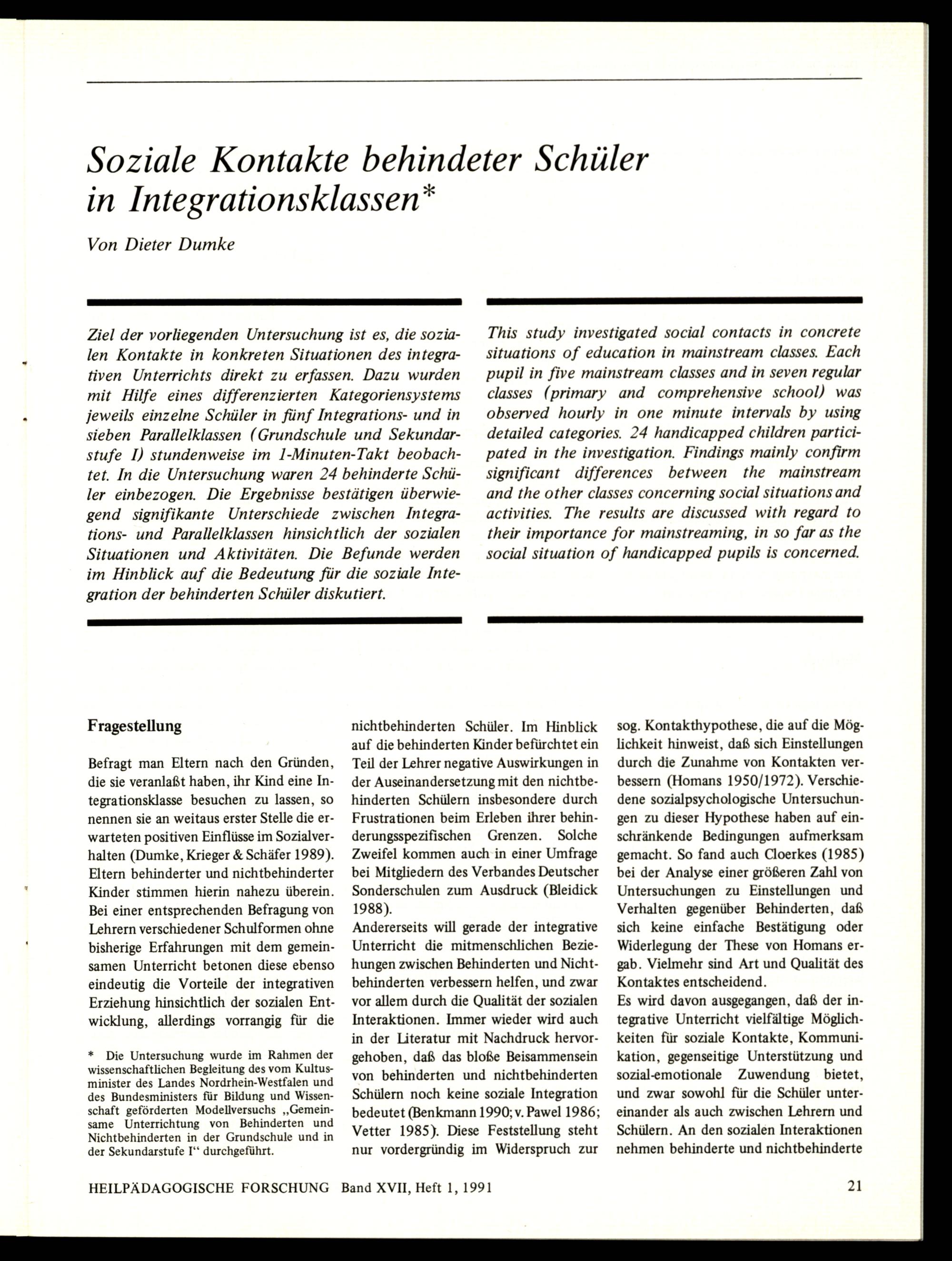 Soziale Kontakte behinderter Schüler in Integrationsklassen