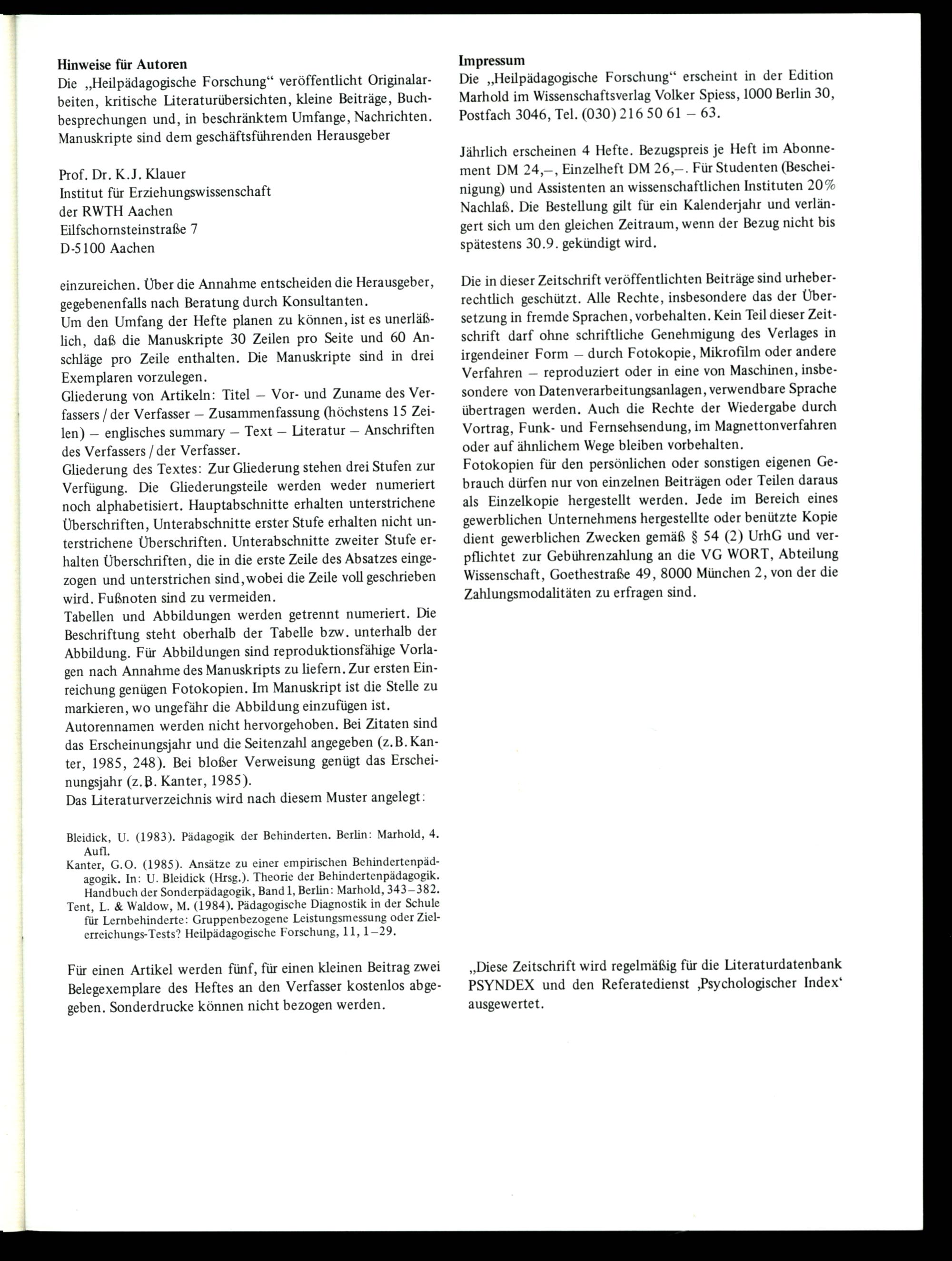 Heilpädagogische Forschung : Zeitschrift für Pädagogik und Psychologie bei Behinderungen