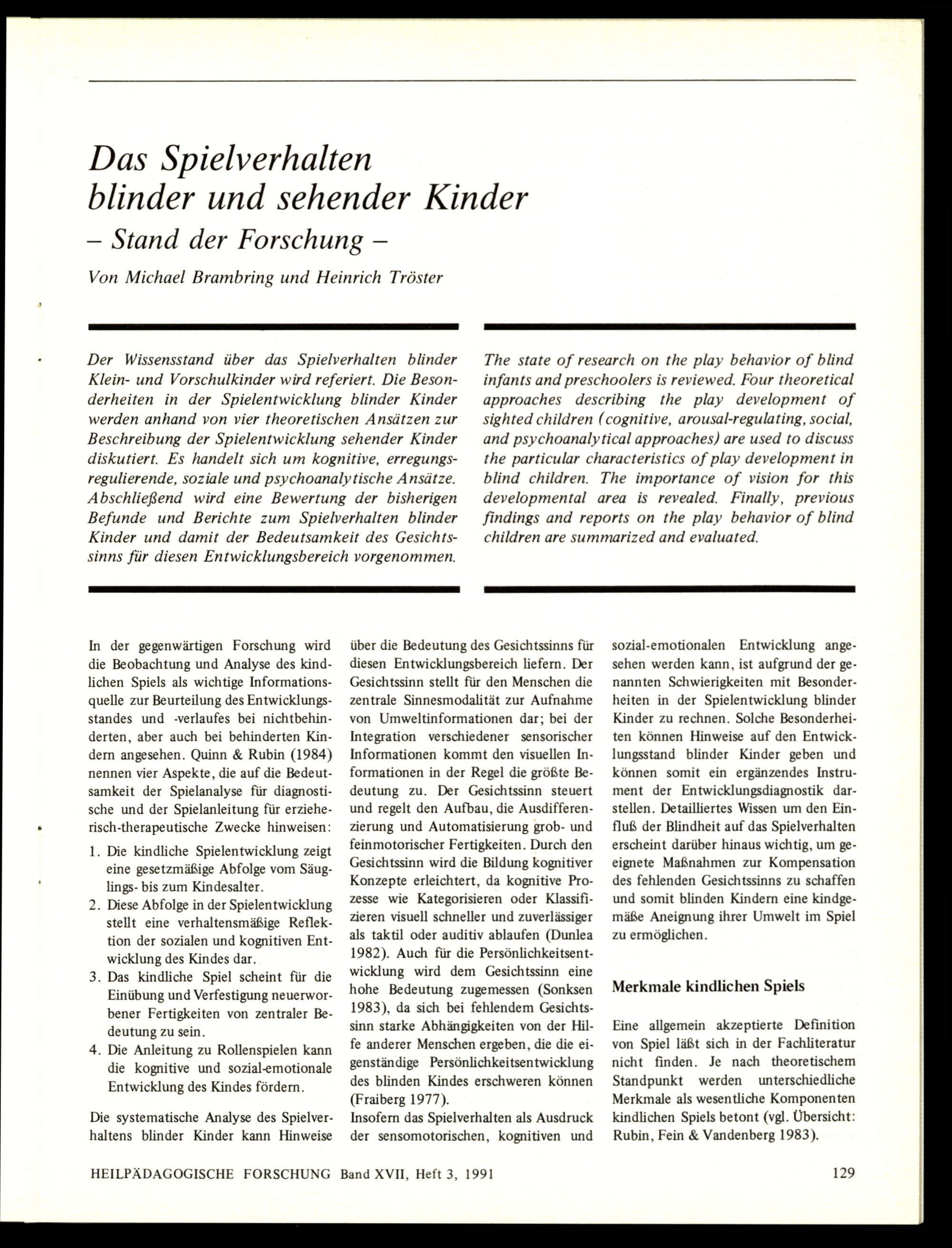 Das Spielverhalten blinder und sehender Kinder. Stand der Forschung.