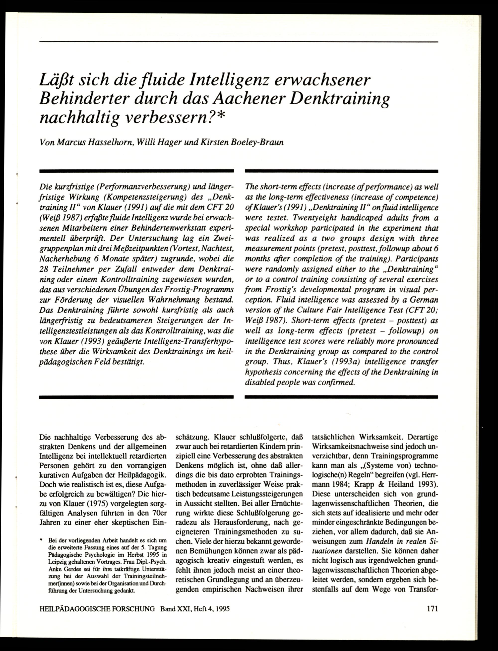 Läßt sich die fluide Intelligenz erwachsener Behinderter durch das Aachener Denktraining...
