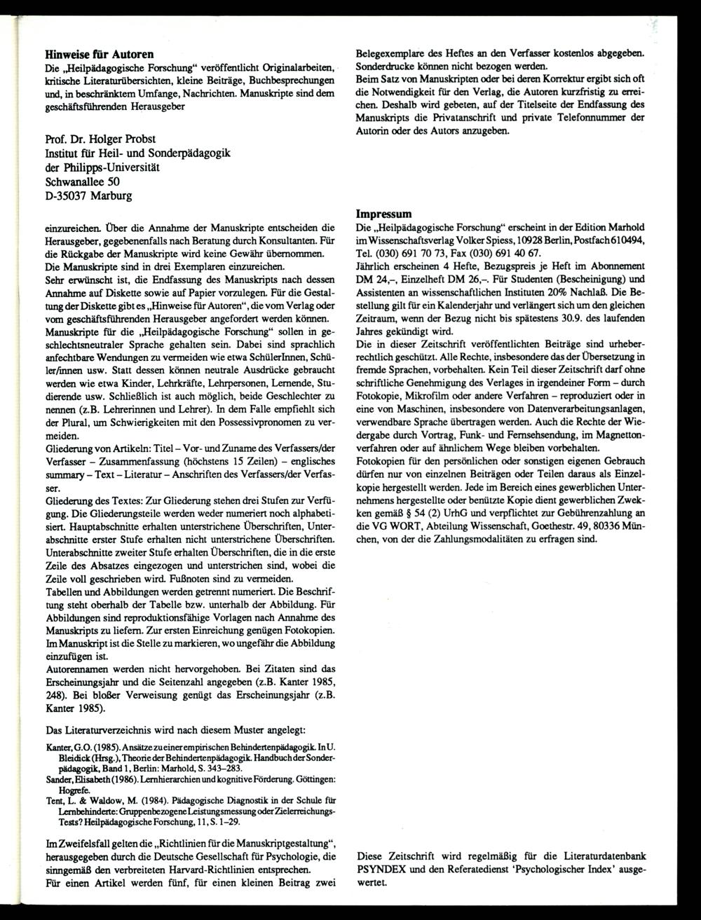 Heilpädagogische Forschung : Zeitschrift für Pädagogik und Psychologie bei Behinderungen