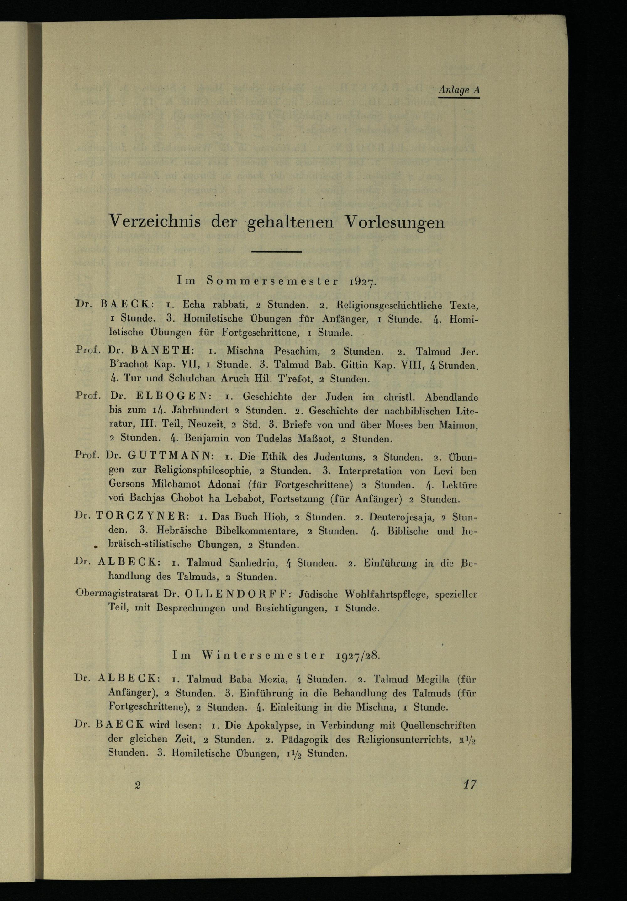 Verzeichnis der gehaltenen Vorlesungen
