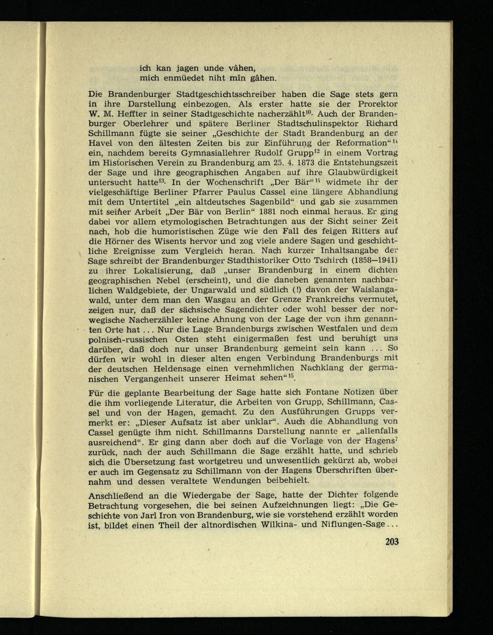 Die Brandenburger Stadtgeschichtsschreiber haben die Sage stets gern in ihre Darstellung einbezogen. Als erster hatte sie der Prorektor W. M. Heffter in seiner Stadtgeschichte nacherzählt 10 - Auch der Brandenburger Oberlehrer und spätere Berliner Stadtschulinspektor Richard Schillmann fügte sie seiner „Geschichte der Stadt Brandenburg an der Havel von den ältesten Zeiten bis zur Einführung der Reformation“ 11 ein, nachdem bereits Gymnasiallehrer Rudolf Grupp 12 in einem Vortrag im Historischen Verein zu Brandenburg am 25. 4. 1873 die Entstehungszeit der Sage und ihre geographischen Angaben auf ihre Glaubwürdigkeit untersucht hatte 13 - In der Wochenschrift „Der Bär“ 1,1 widmete ihr der vielgeschäftige Berliner Pfarrer Paulus Cassel eine längere Abhandlung mit dem Untertitel „ein altdeutsches Sagenbild“ und gab sie zusammen mit seifter Arbeit „Der Bär von Berlin“ 1881 noch einmal heraus. Er ging dabei vor allem etymologischen Betrachtungen aus der Sicht seiner Zeit nach, hob die humoristischen Züge wie den Fall des feigen Ritters auf die Hörner des Wisents hervor und zog viele andere Sagen und geschichtliche Ereignisse zum Vergleich heran. Nach kurzer Inhaltsangabe der Sage schreibt der Brandenburger Stadthistoriker Otto Tschirch (1858—1941) zu ihrer Lokalisierung, daß „unser Brandenburg in einem dichten geographischen Nebel (erscheint), und die daneben genannten nachbarlichen Waldgebiete, der Ungarwald und südlich (!) davon der Waislanga- wald, unter dem man den Wasgau an der Grenze Frankreichs vermutet, zeigen nur, daß der sächsische Sagendichter oder wohl besser der norwegische Nacherzähler keine Ahnung von der Lage der von ihm genannten Orte hat ... Nur die Lage Brandenburgs zwischen Westfalen und dem polnisch-russischen Osten steht einigermaßen fest und beruhigt uns darüber, daß doch nur unser Brandenburg gemeint sein kann ... So dürfen wir wohl in dieser alten engen Verbindung Brandenburgs mit der deutschen Heldensage einen vernehmlichen Nachklang der germanischen Vergangenheit unserer Heimat sehen“ *•’.