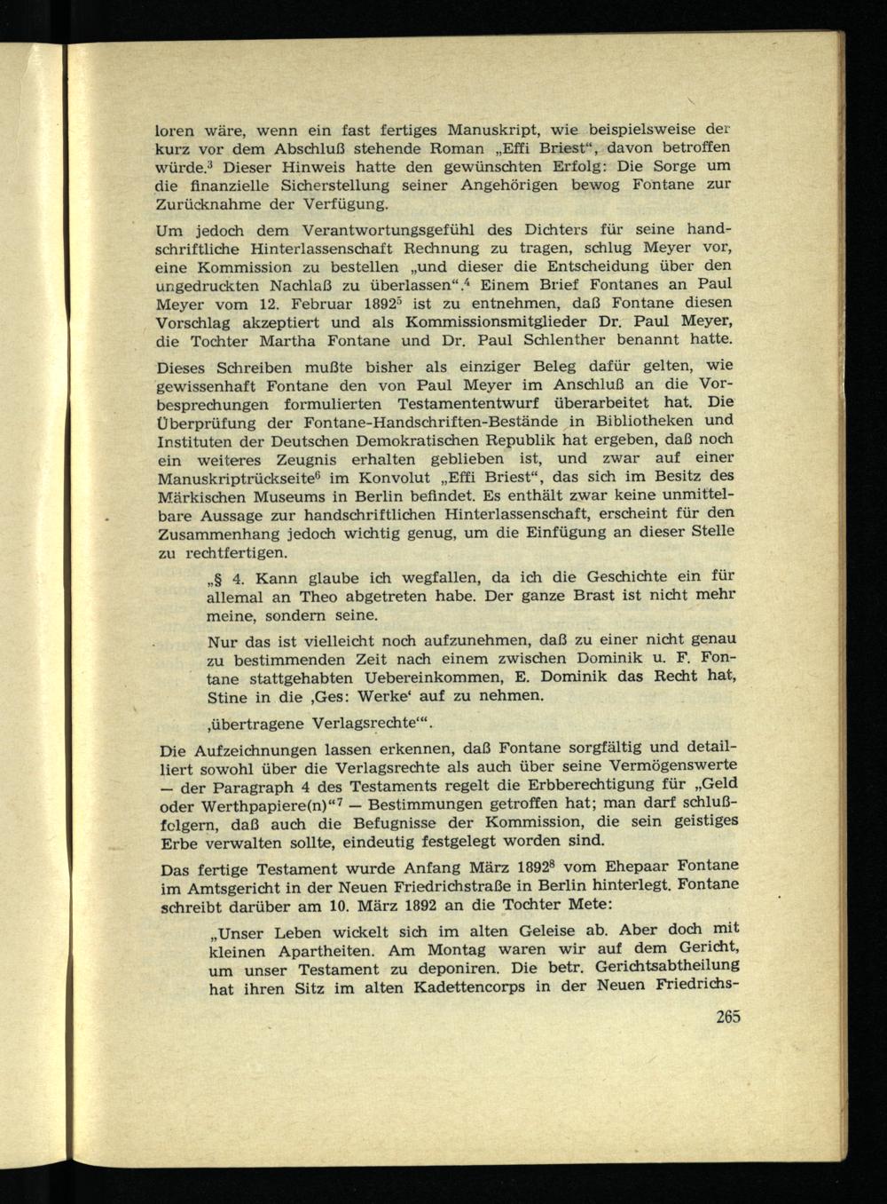 Die Aufzeichnungen lassen erkennen, daß Fontane sorgfältig und detailliert sowohl über die Verlagsrechte als auch über seine Vermögenswerte — der Paragraph 4 des Testaments regelt die Erbberechtigung für „Geld oder Werthpapiere(n)“ 7 — Bestimmungen getroffen hat; man darf schlußfolgern, daß auch die Befugnisse der Kommission, die sein geistiges Erbe verwalten sollte, eindeutig festgelegt worden sind.